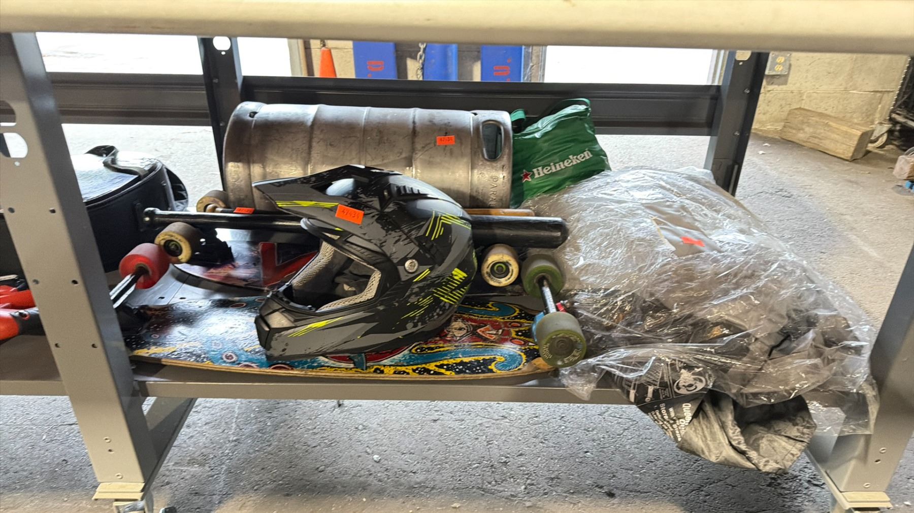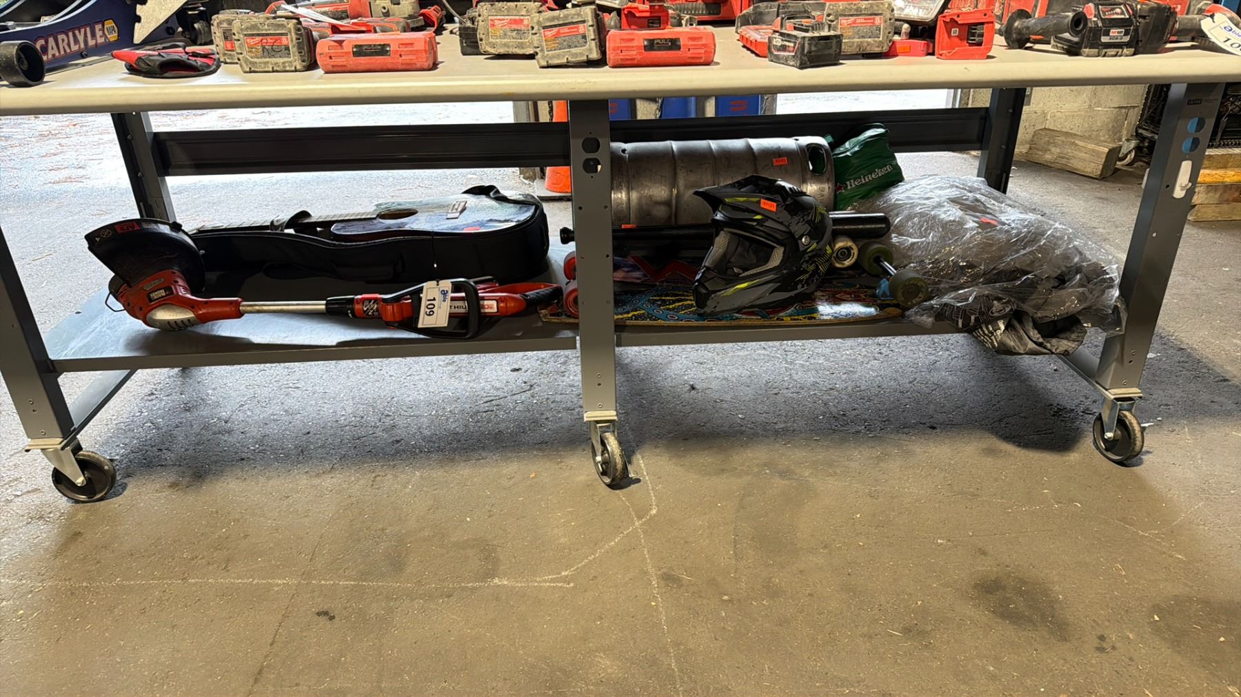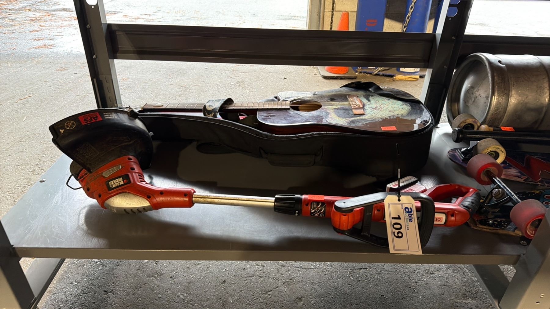 BLACK & DECKER CORDLESS WEED EATER WITH BATTERY, ACOUSTIC GUITAR IN CASE, 2 LONG BOARDS, HELMET, AIR MATTRESS, BAG OF GOLF BALLS & ALUMINUM BEER KEG