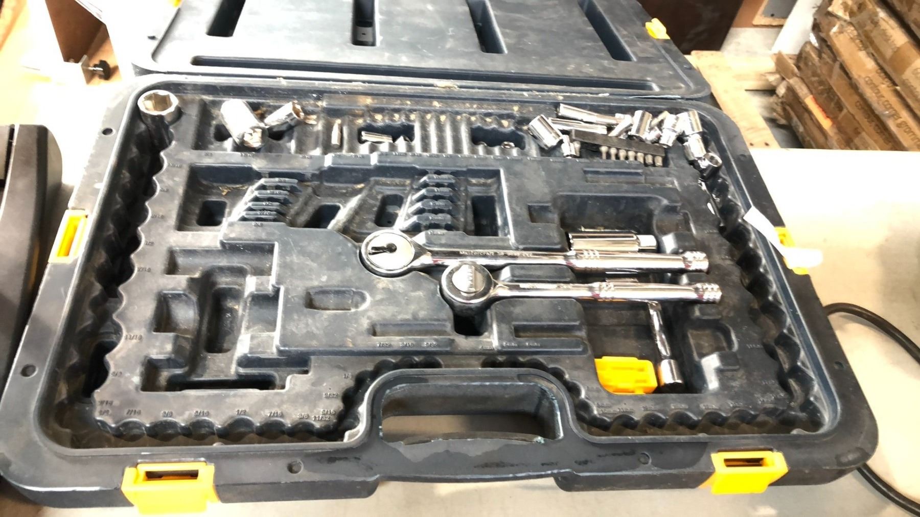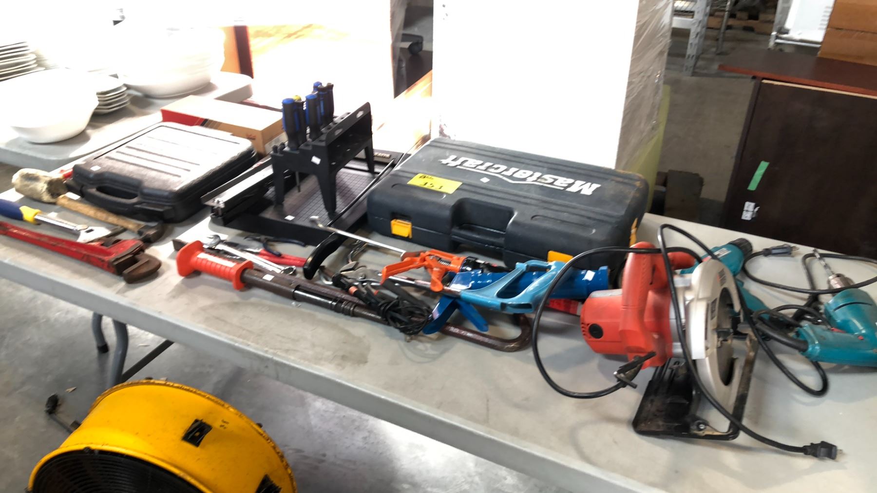 BLACK & DECKER ELECTRIC CIRCULAR SAW, 2 MAKITA ELECTRIC POWER DRILLS, MASTERCRAFT SOCKET SET IN HARD CASE (MISSING PIECES), DEWALT INDUSTRIAL FAN, MISC HAND TOOLS *LOCATED AT 101-11539 136 ST SURREY*