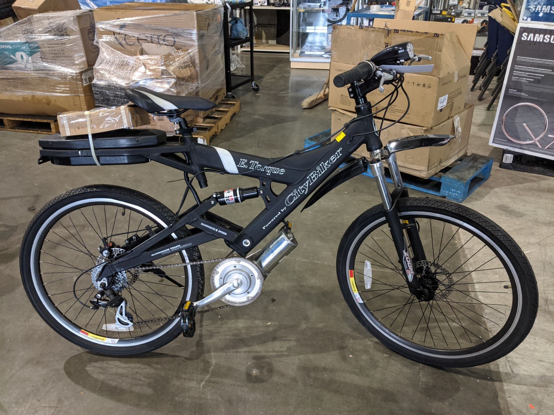 BLACK E.TORQUE ELECTRIC 8 SPEED CITY BICYCLE WITH FRONT & REAR DISC BRAKES, CHARGER AND HELMET