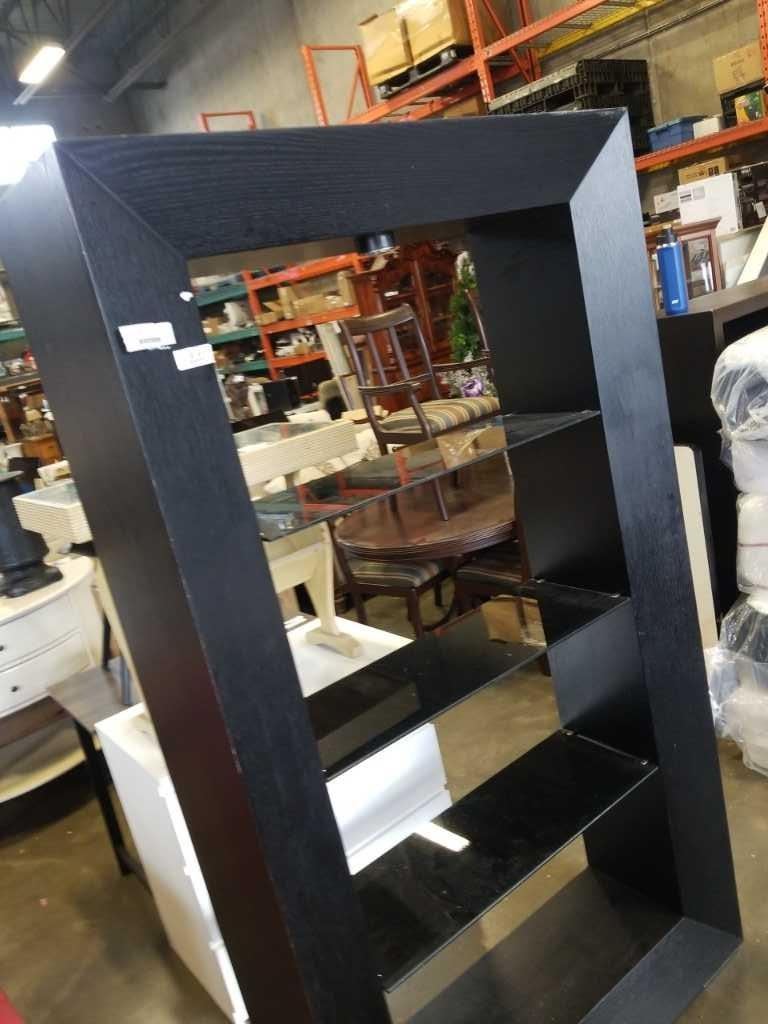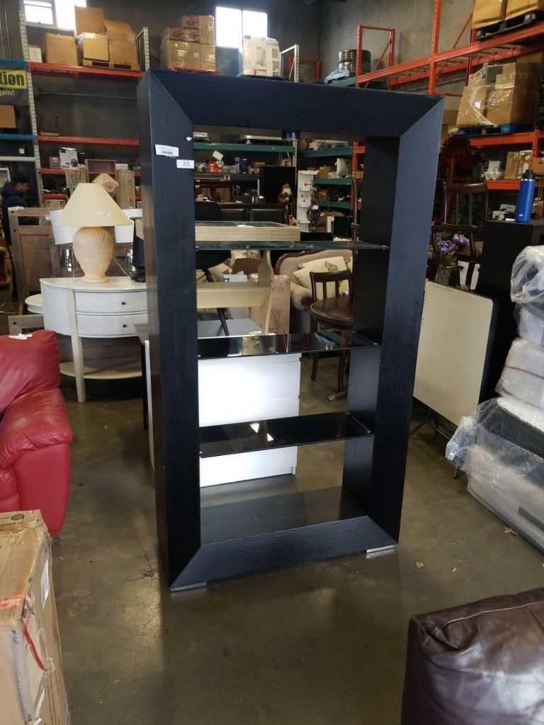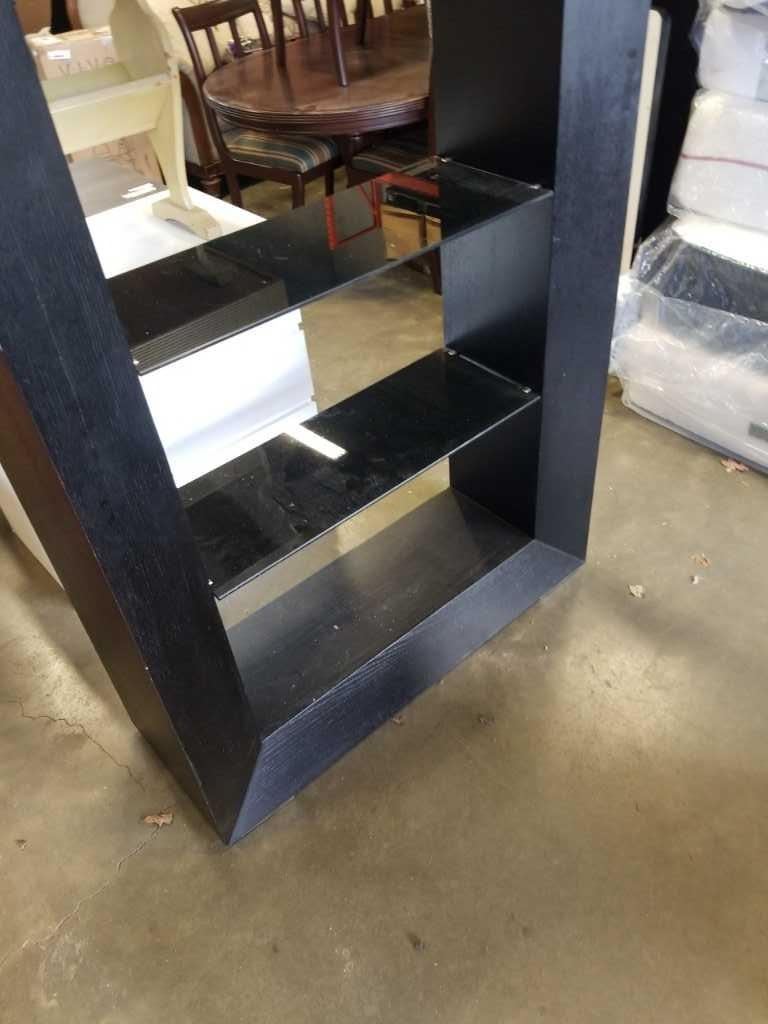 BLACK FINISH SOLID WOOD MODERN DISPLAY SHELF, WITH 3 SMOKED BLACK GLASS DISPLAYS, CAN BE ILLUMINATED, FULLY FINISHED ON BOTH SIDES