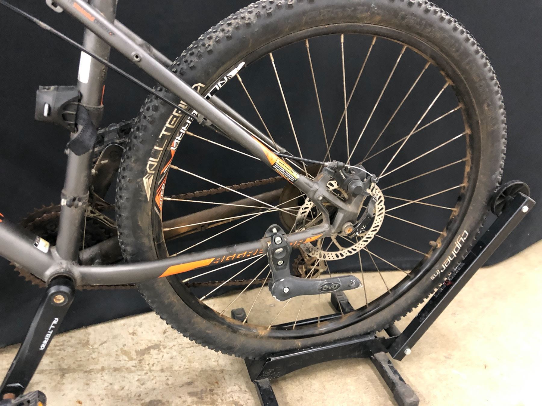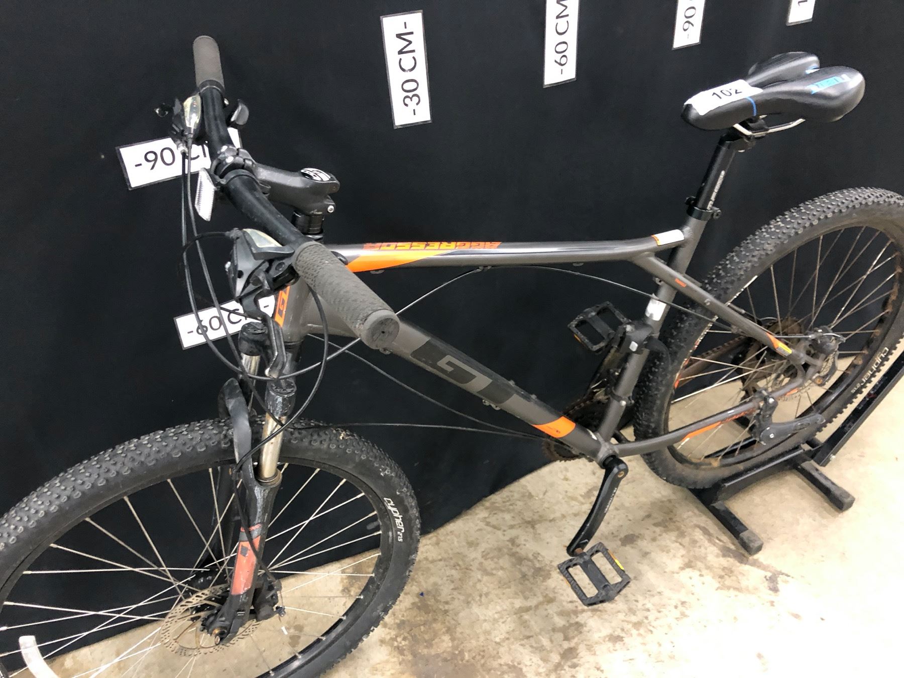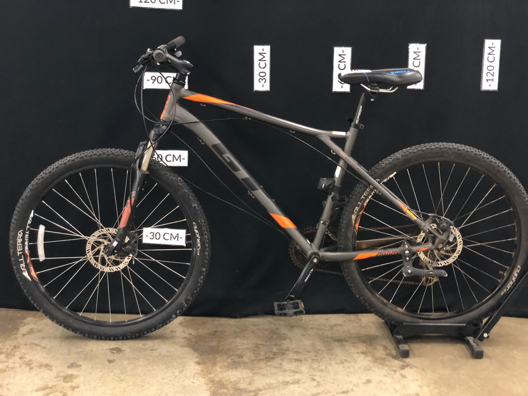 BLACK GT AGGRESSOR 21 SPEED FRONT SUSPENSION MOUNTAIN BIKE WITH FRONT AND REAR DISC BRAKES, LARGE FRAME SIZE, 82 CM STANDOVER HEIGHT, KICKSTAND BROKEN