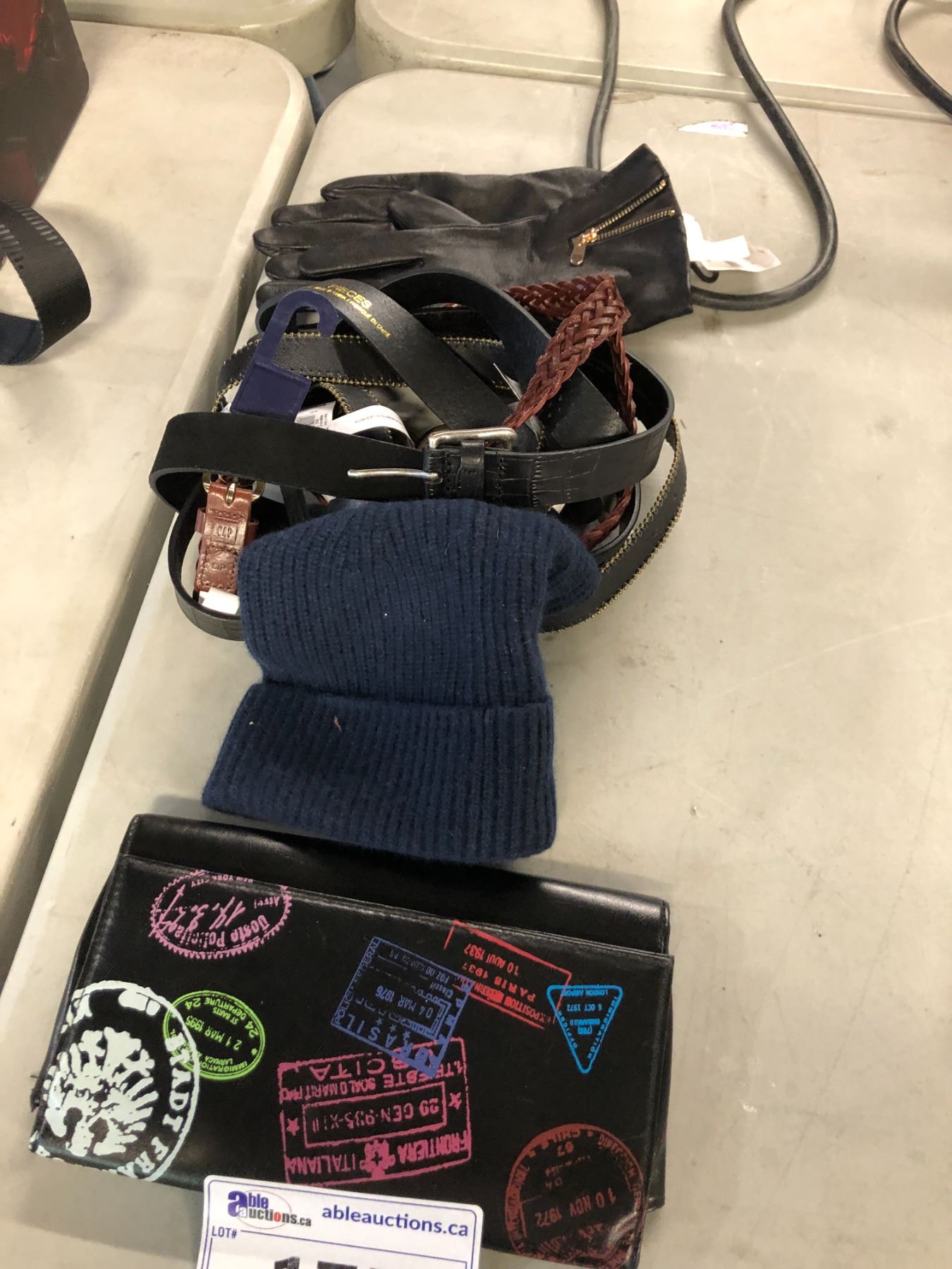 BLACK LEATHER STYLE TRAVEL ORGANIZER, WOMEN'S LEATHERY STYLE GLOVES ASSORTED BELTS AND BLUE TOQUE