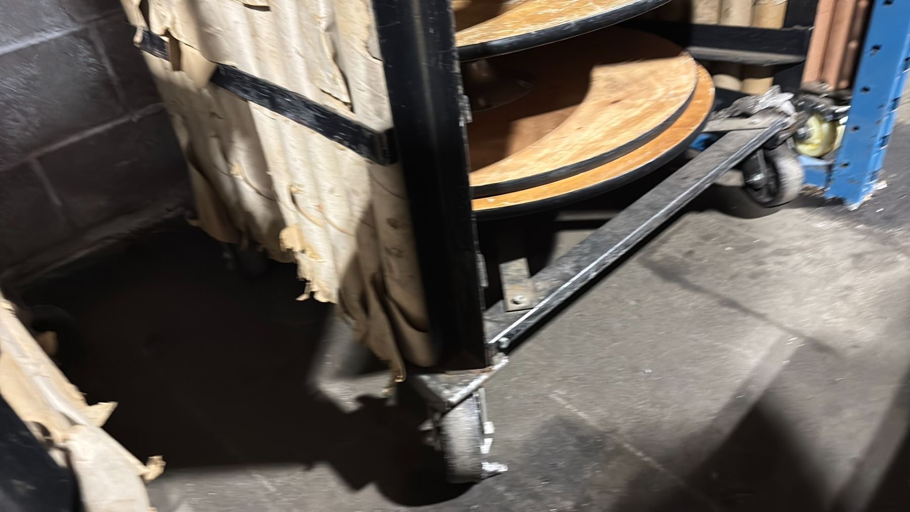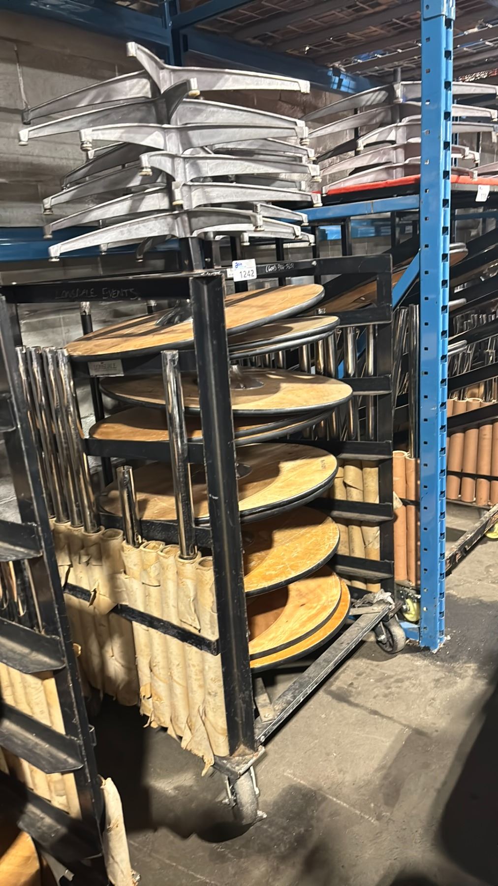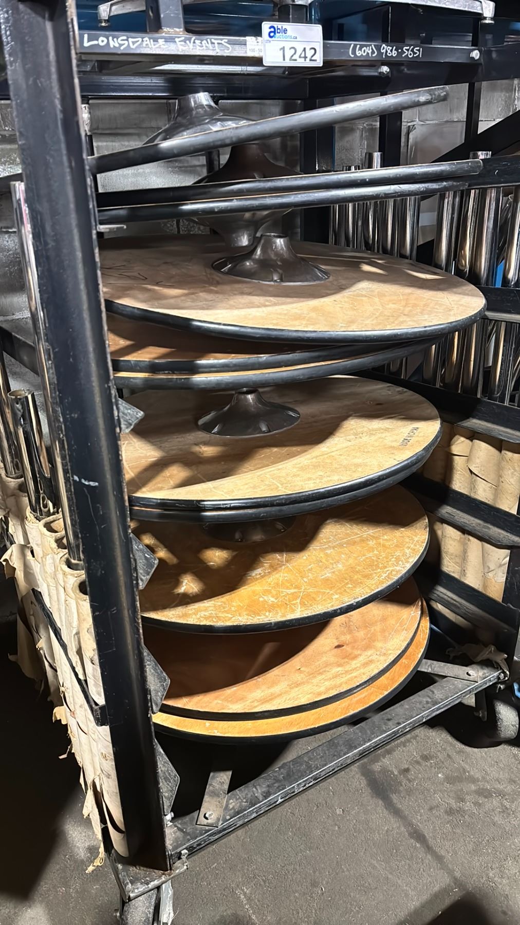 BLACK METAL MOBILE COCKTAIL TABLE EVENT CART WITH ASSORTED WOODEN 3 PCS COCKTAIL TABLES / STANDS / BASES *MOBILE CART INCLUDED*