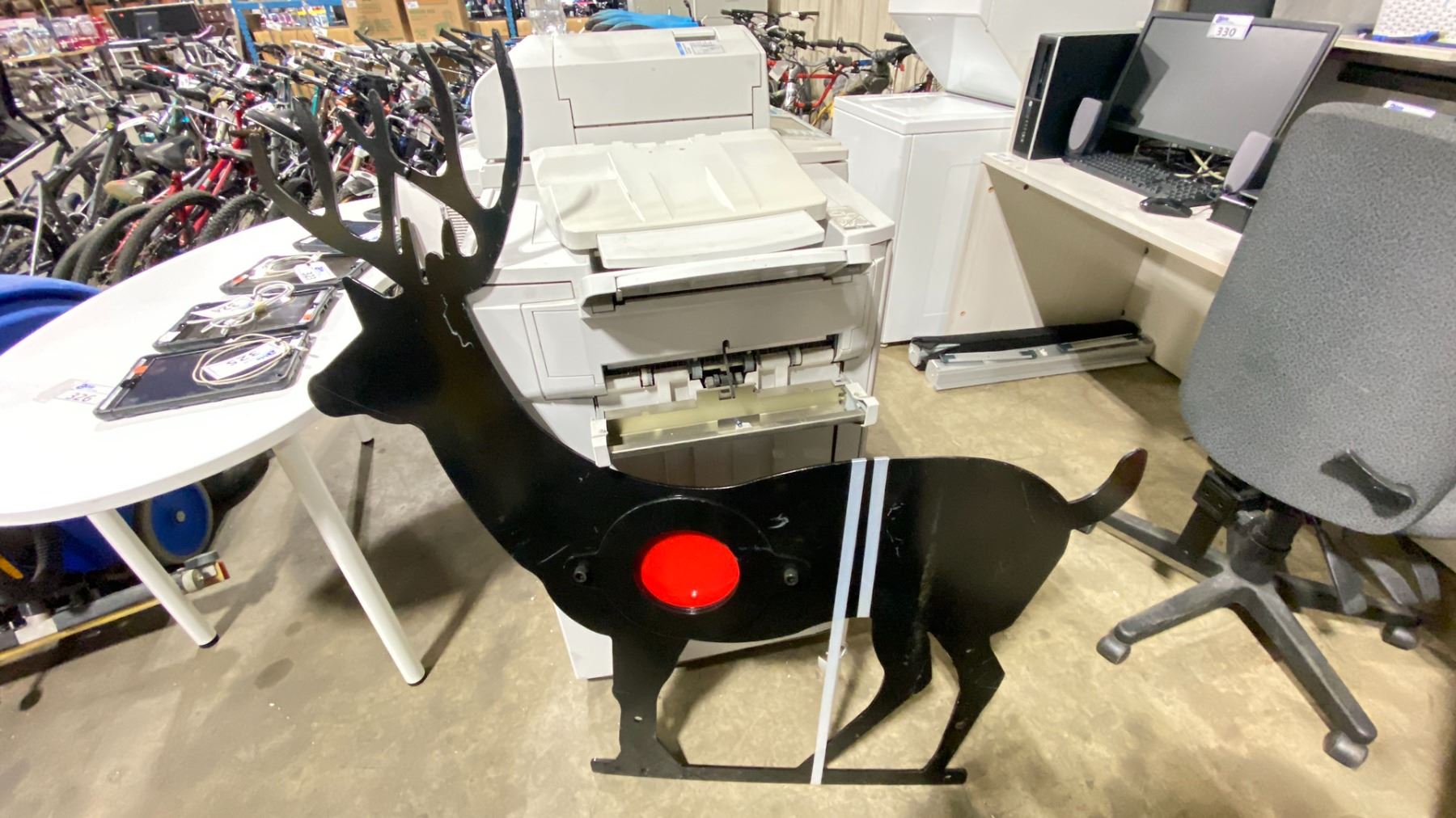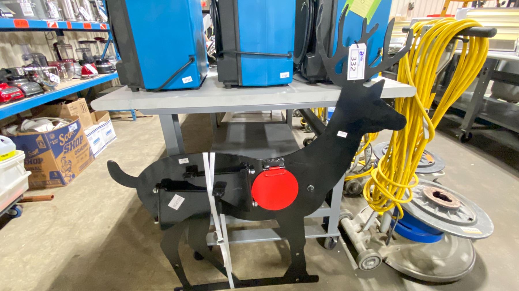 BLACK METAL STANDING DEER TARGET WITH RED HEART FLAPPER APPROX 48"H X 45"W