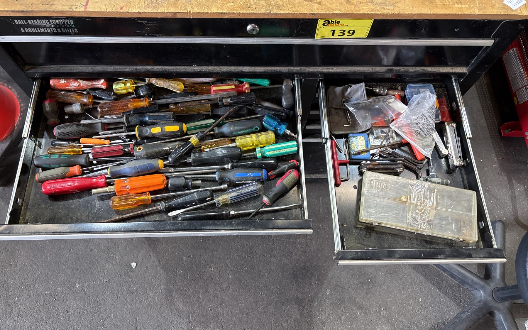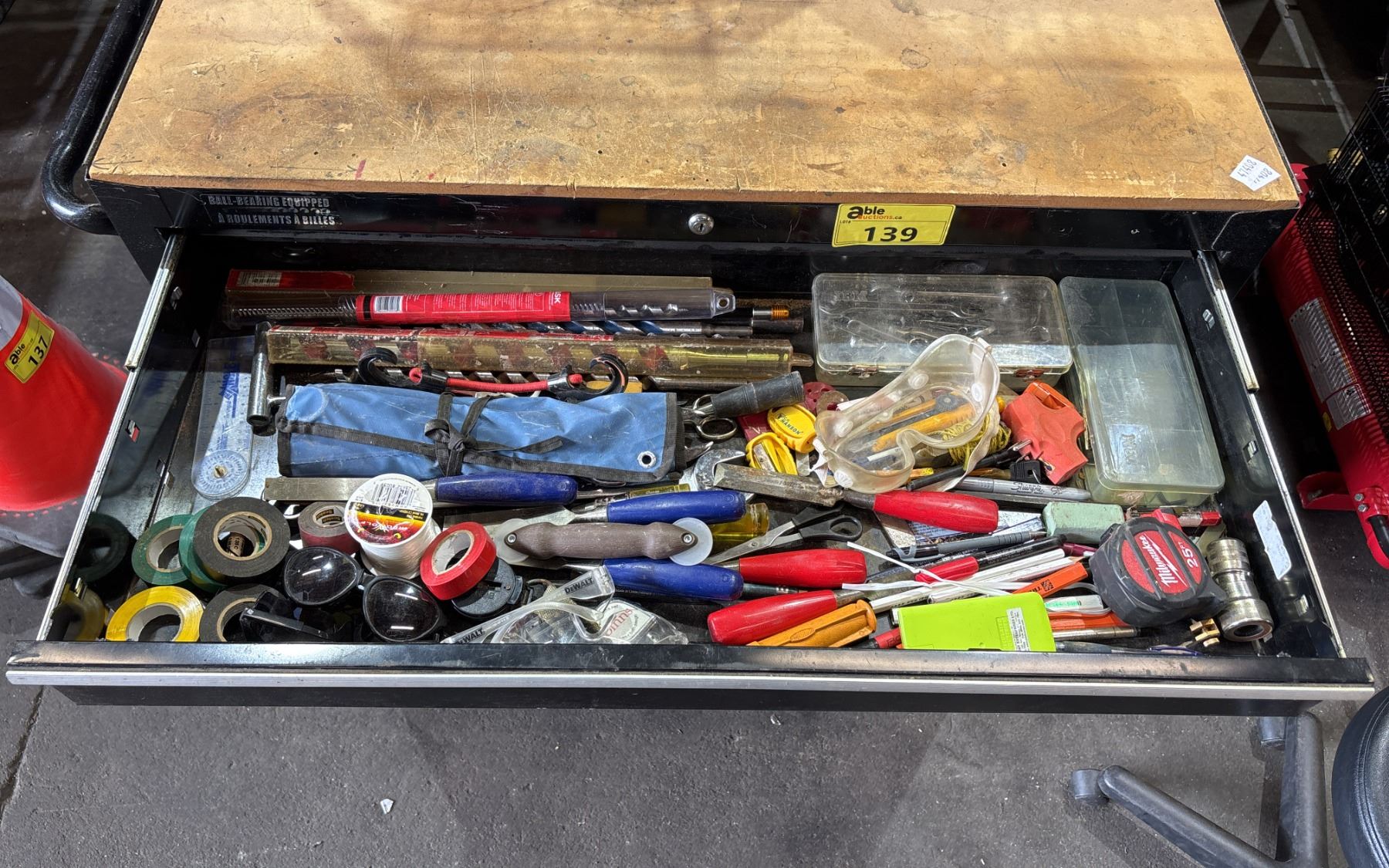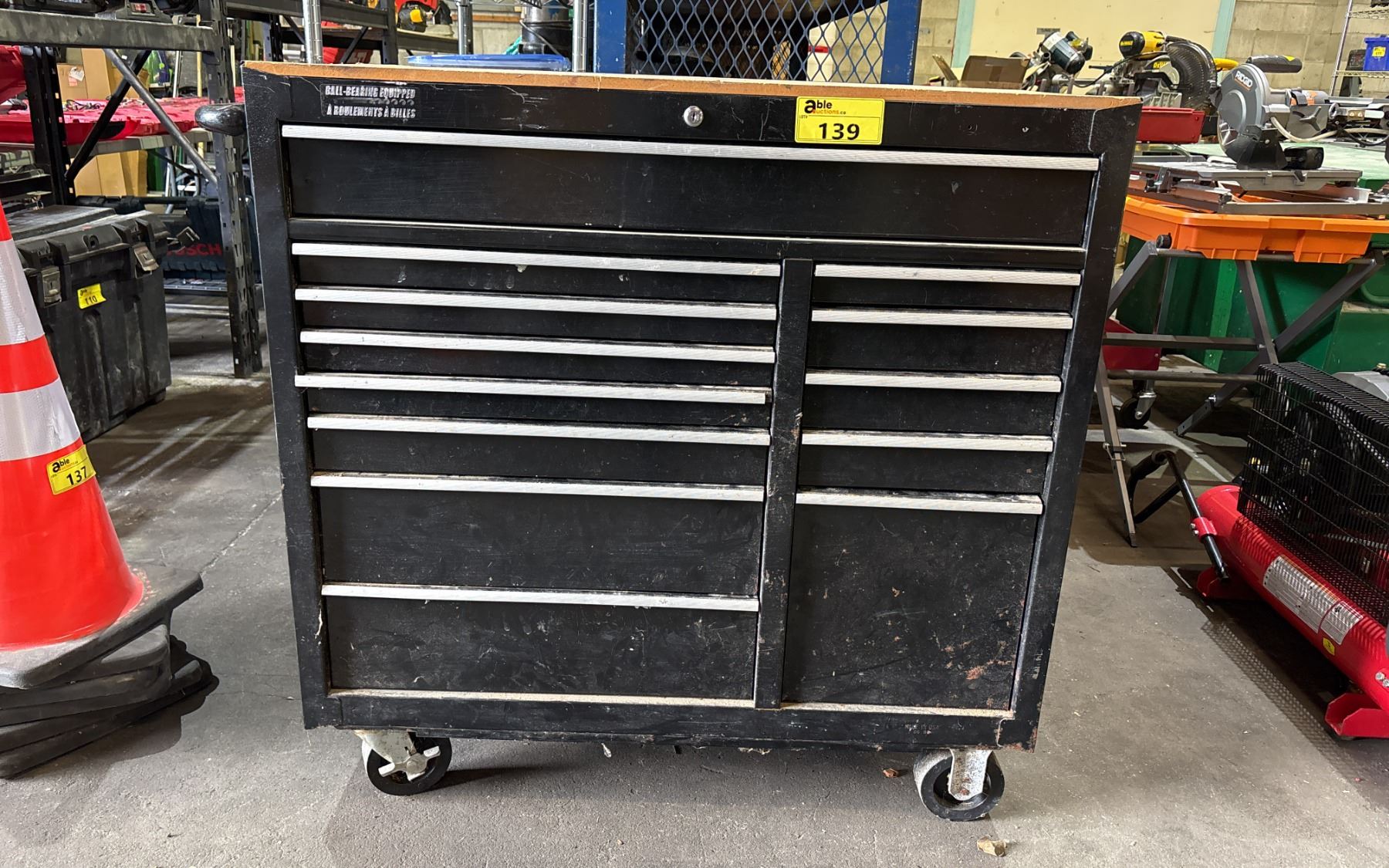 BLACK METAL/WOODEN TOP 45"W X 18"D X 41"H MOBILE 13 DRAWER TOOL BOX WITH CONTENTS