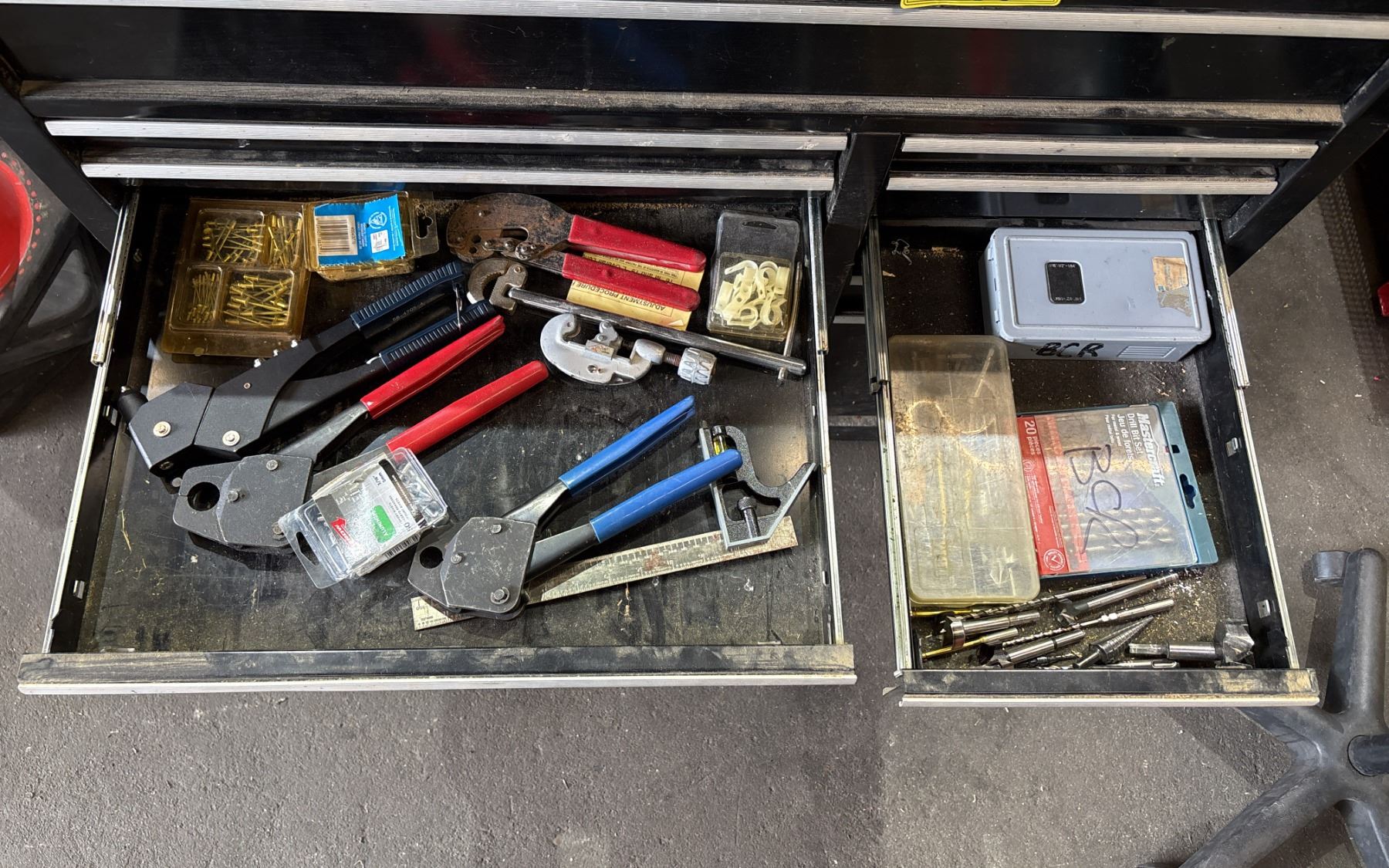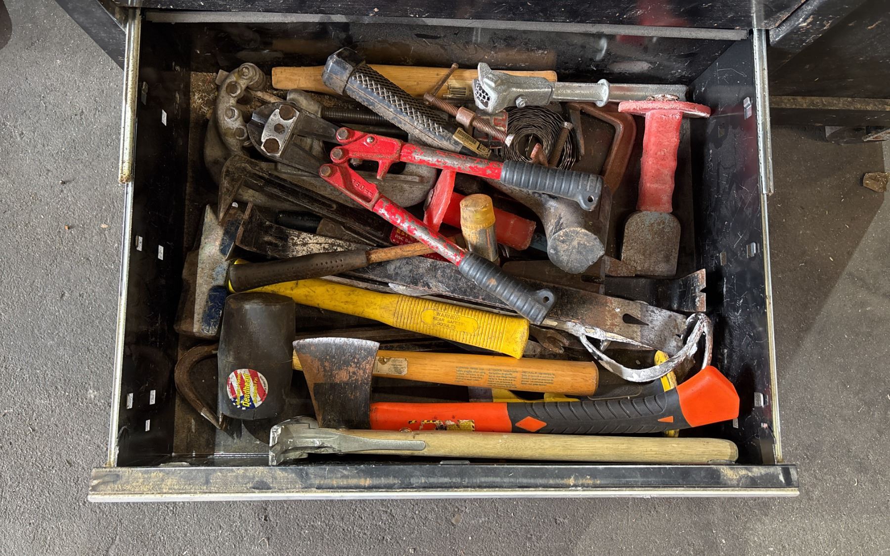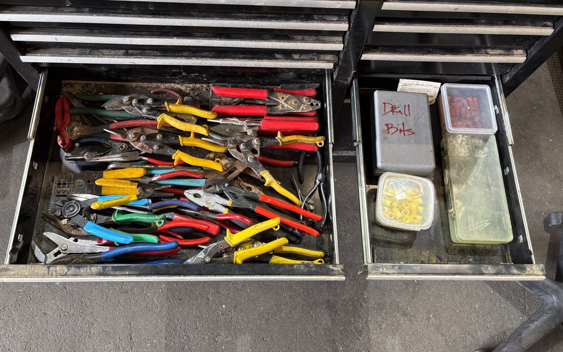 BLACK METAL/WOODEN TOP 45"W X 18"D X 41"H MOBILE 13 DRAWER TOOL BOX WITH CONTENTS