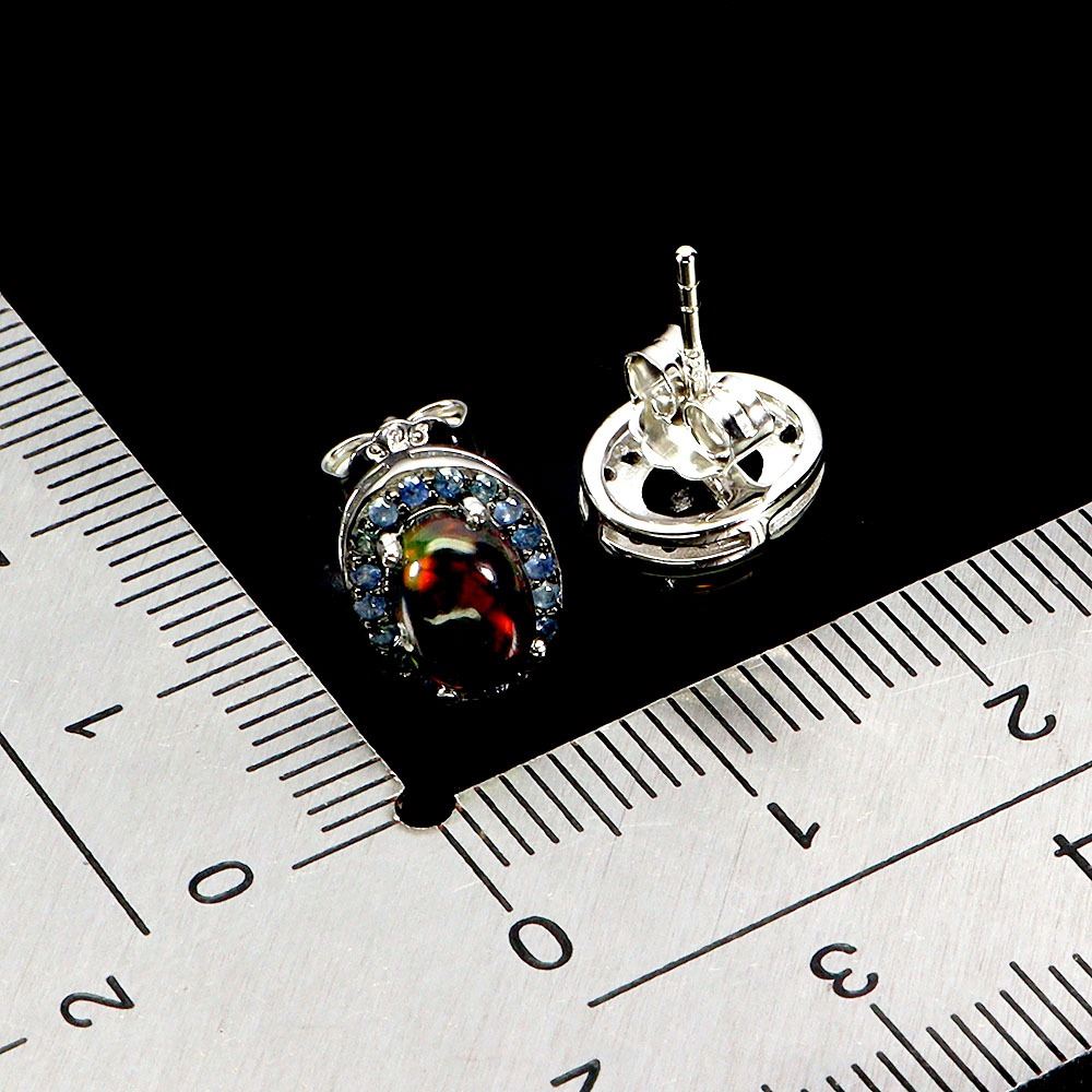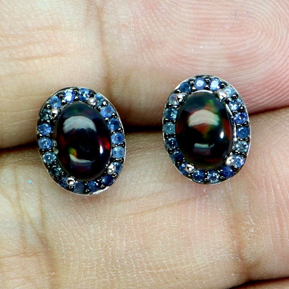 BLACK OPAL AND BLUE SAPPHIRE EARRINGS IN 14K WHITE PLATED GOLD OVER 925 STERLING SILVER - APPRAISED REPLACEMENT VALUE
