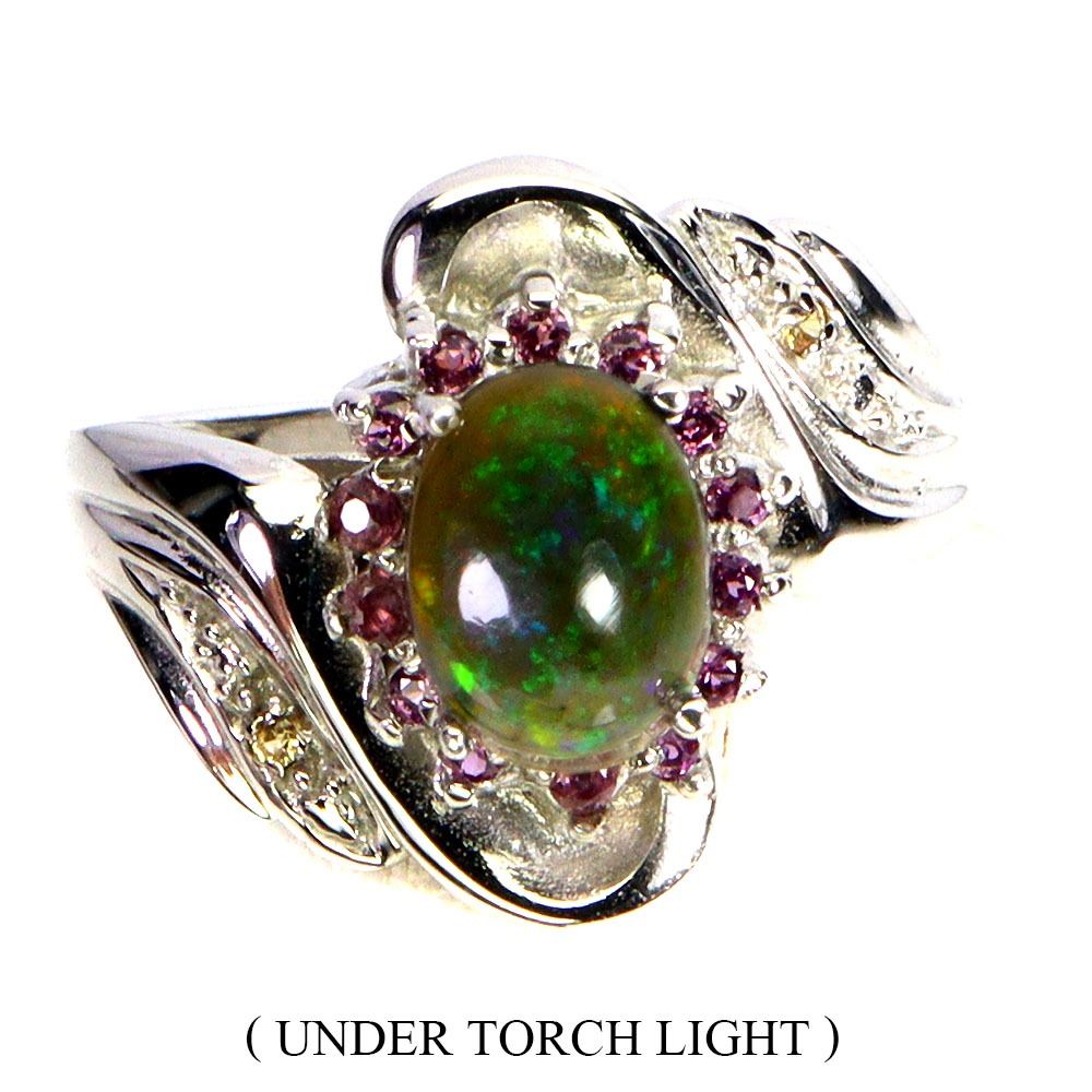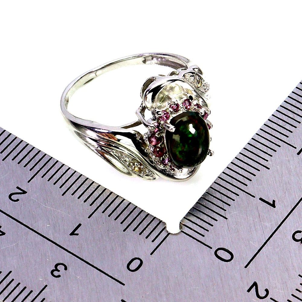 BLACK OPAL AND SAPPHIRE RING IN 14K WHITE PLATED GOLD OVER 925 STERLING SILVER - SIZE 7 - APPRAISED