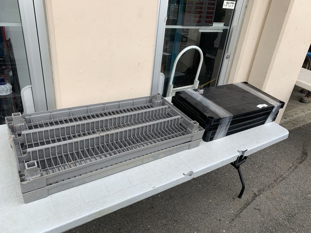 BLACK PLASTIC 4 TIER STORAGE SHELF, 28 X 15 INCH AND GREY 2 TIER SHELF UNIT