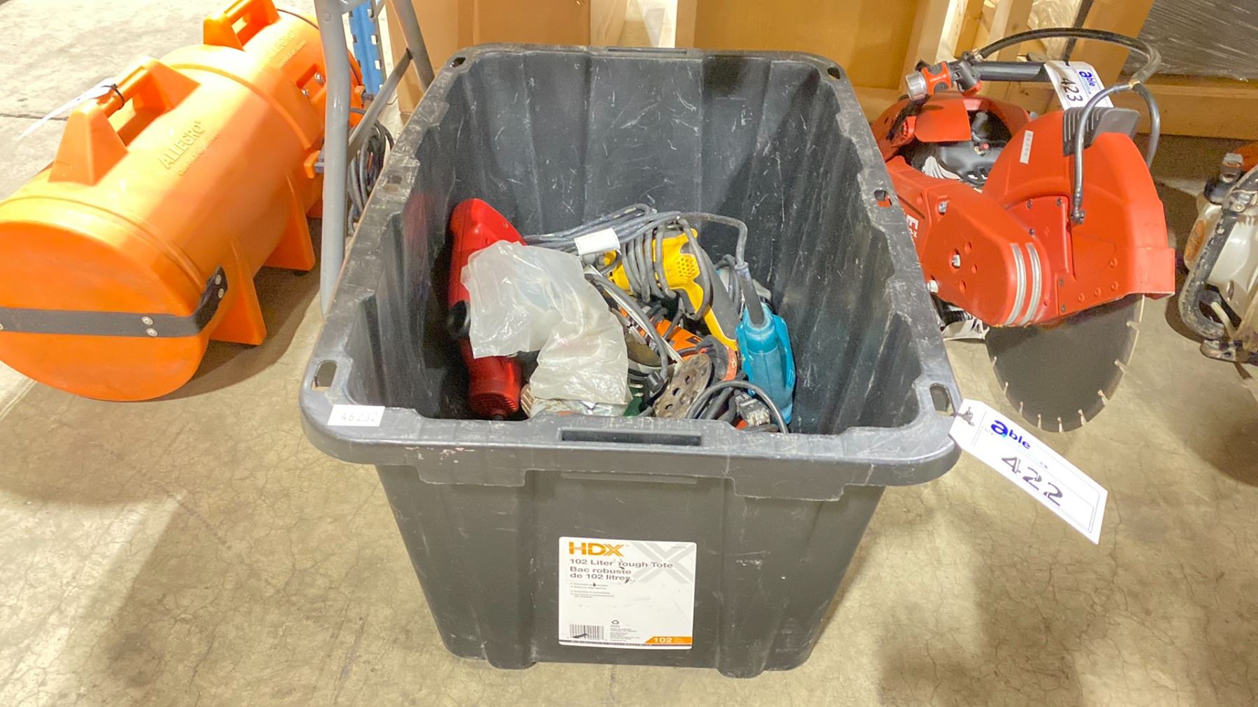 BLACK PLASTIC BIN OF ASSORTED INDUSTRIAL ELECTRIC POWER TOOLS *BIN NOT INCLUDED*