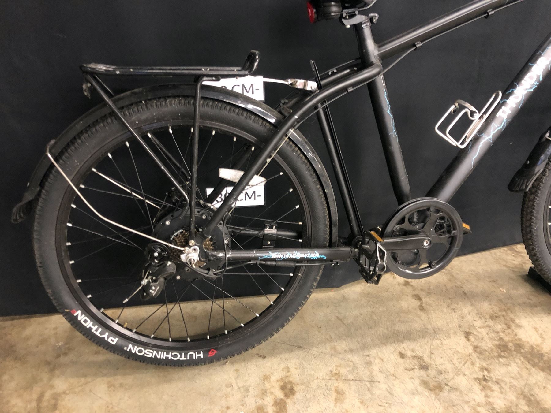 BLACK THUNDER E-BIKE 7 SPEED ELECTRIC ASSIST FRONT SUSPENSION TRAIL BIKE WITH FRONT AND REAR DISC BRAKES, NO CHARGER, NO BATTERY, NO KEY, NO CHAIN, CONDITION UNKNOWN, STANDOVER HEIGHT: 84 CM