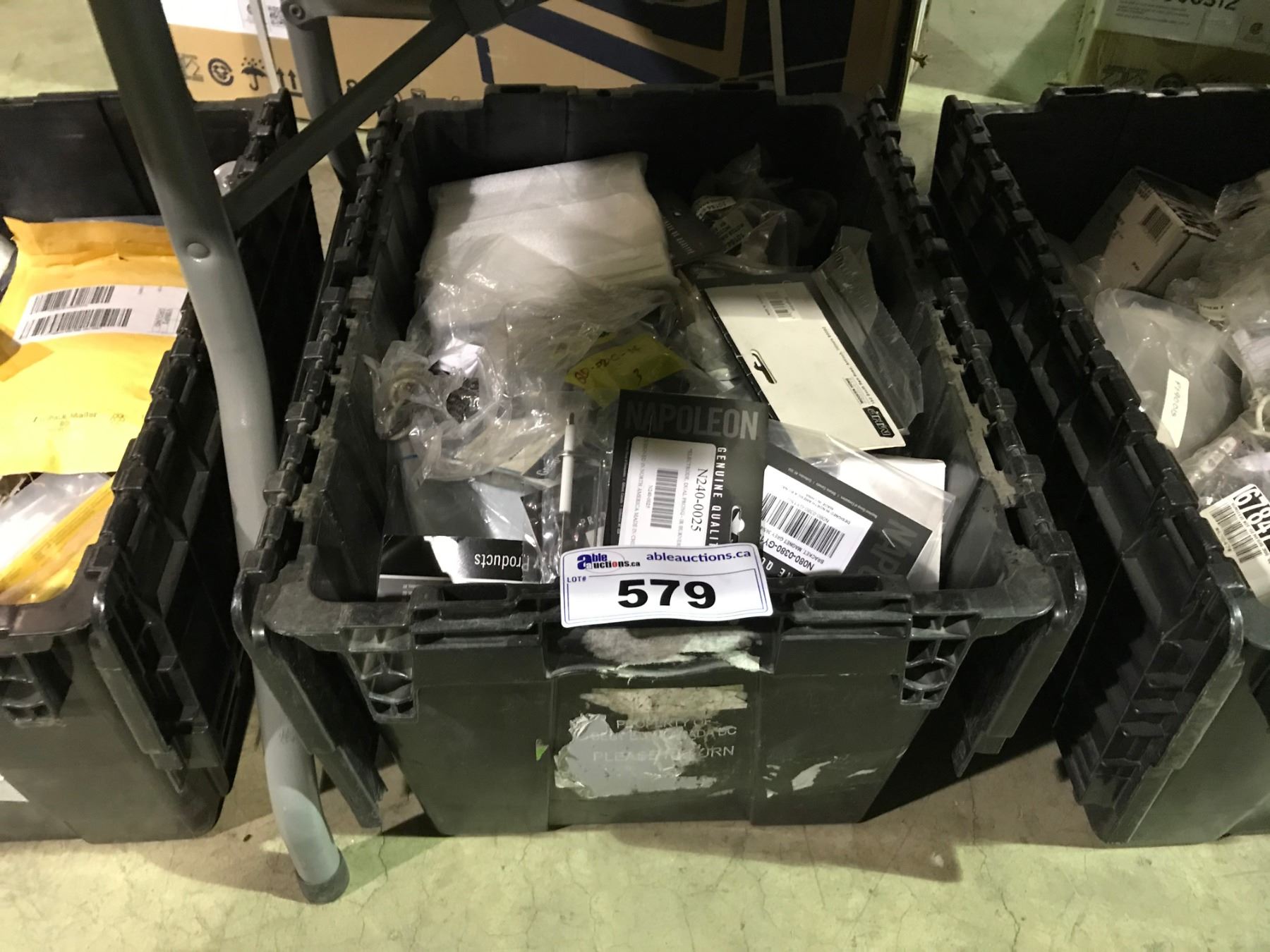 BLACK TOTE OF ASSORTED BARBEQUE PARTS & PRODUCTS ( BIN NOT INCLUDED )