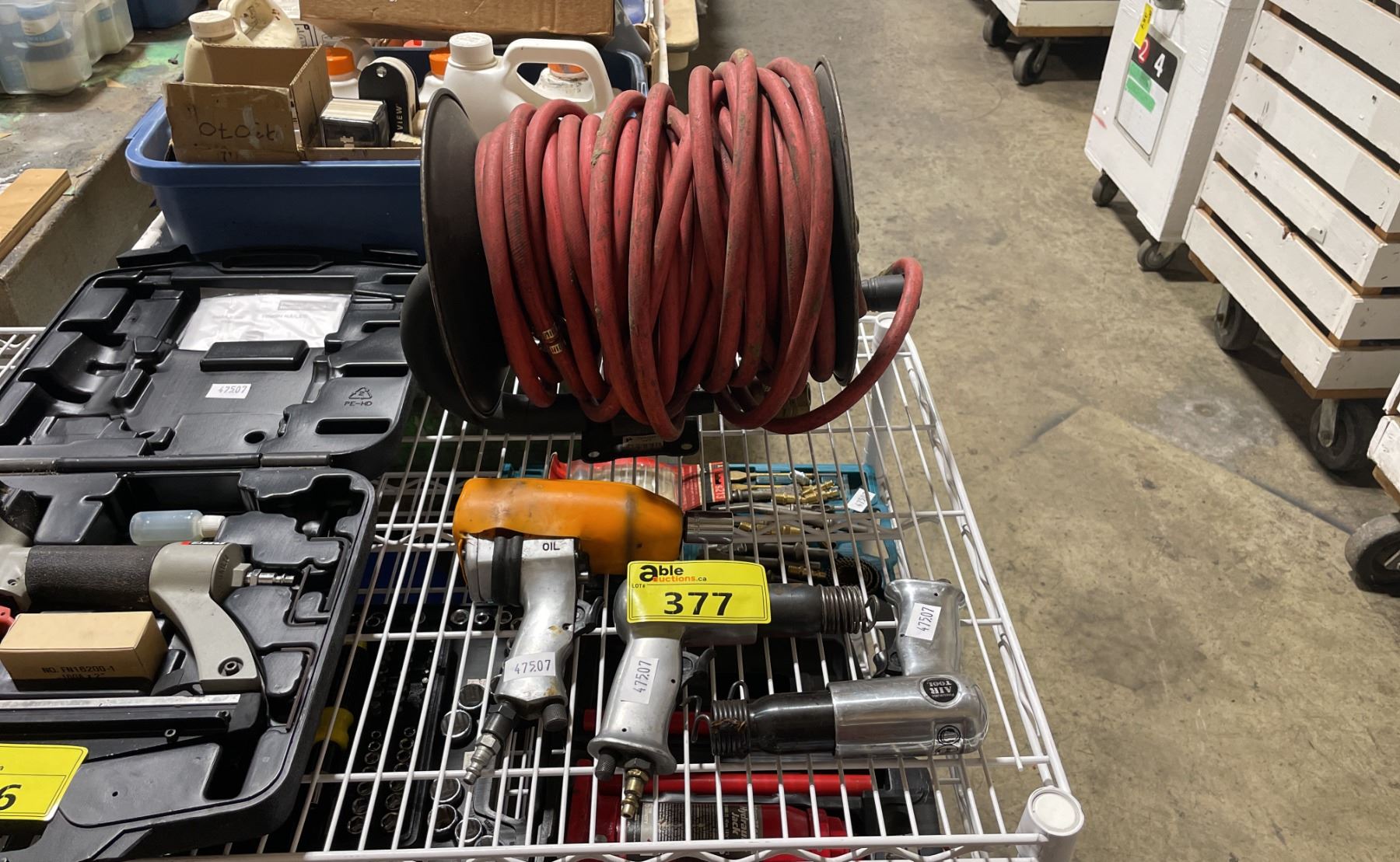 BLACK WALL HUNG AIR HOSE REEL WITH HOSE, 2 PNEUMATIC CHISELS, & PNEUMATIC IMPACT GUN