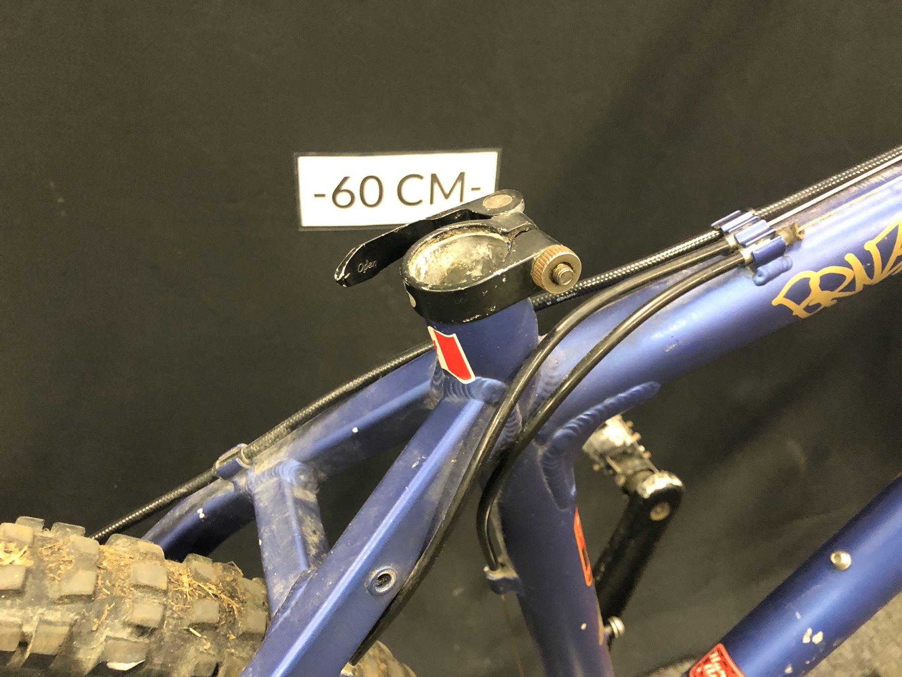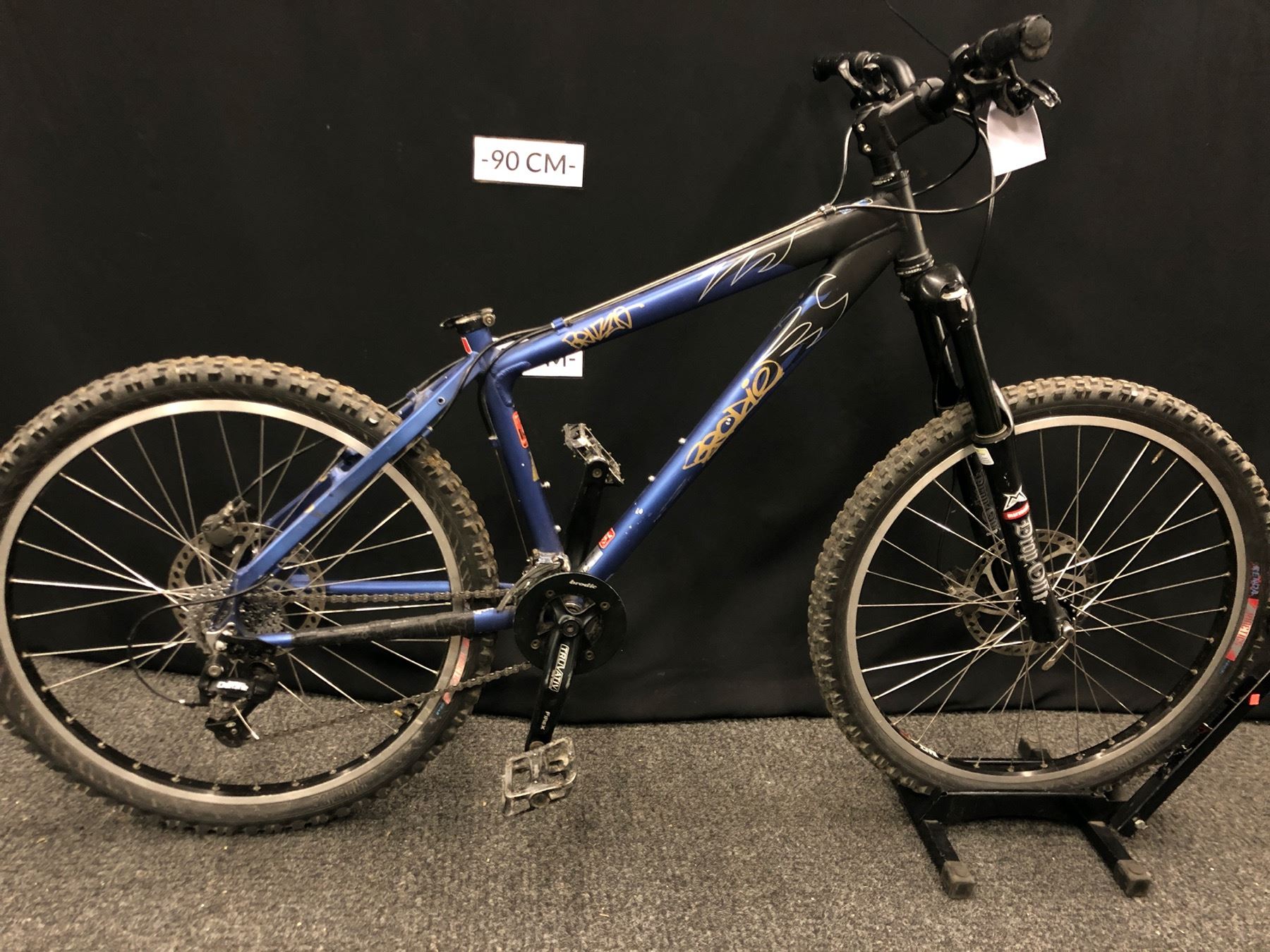 BLUE AND BLACK BRODIE BRUZZA 16 SPEED FRONT SUSPENSION MOUNTAIN BIKE WITH FRONT AND REAR HYDRAULIC DISC BRAKES, REAR BRAKE NEEDS REPAIR, NO SEAT