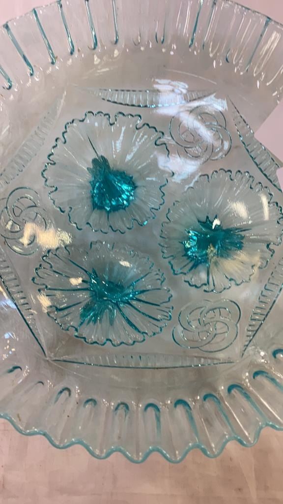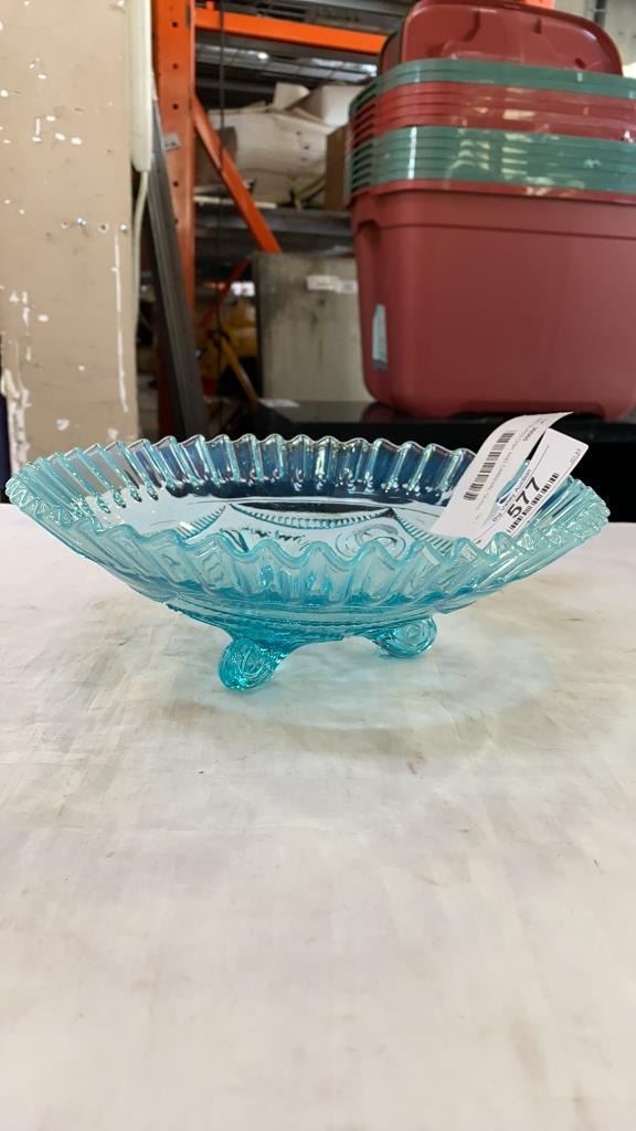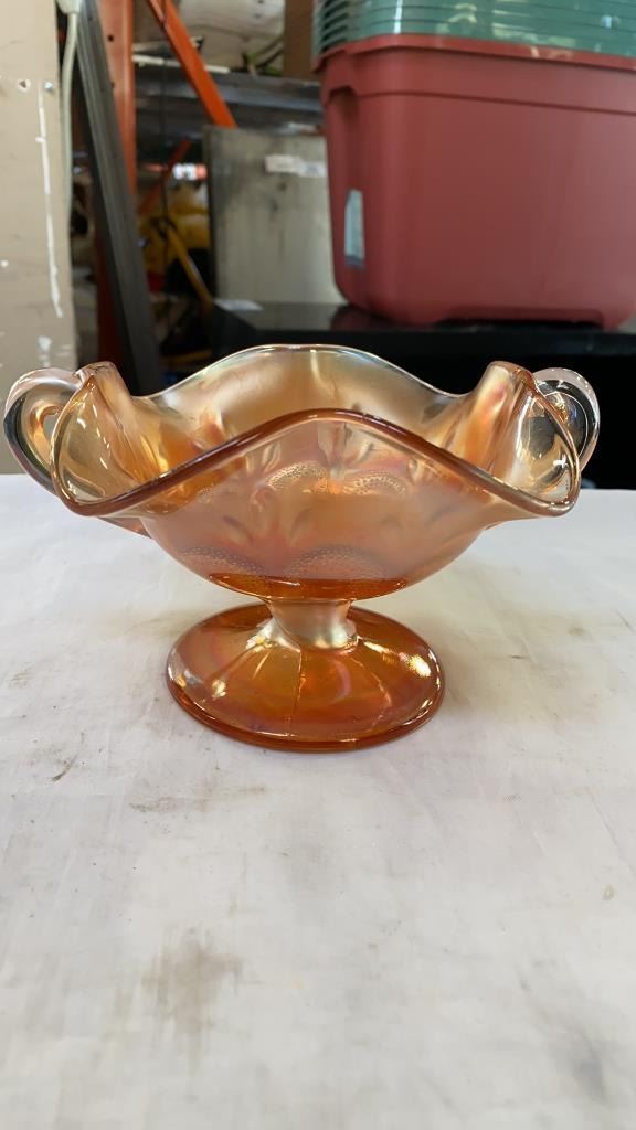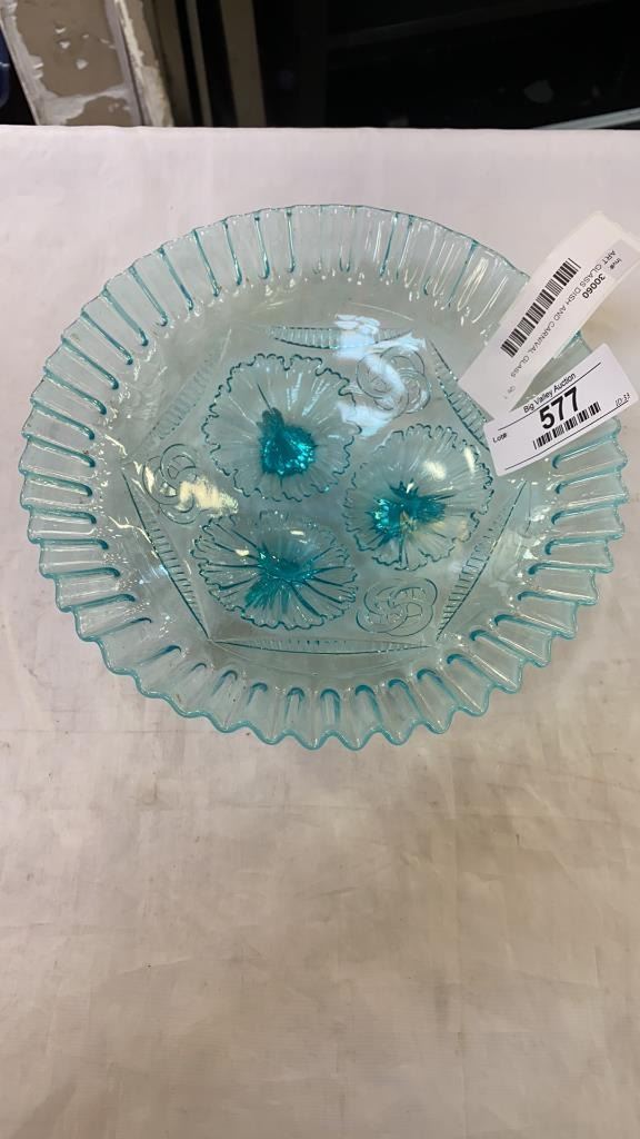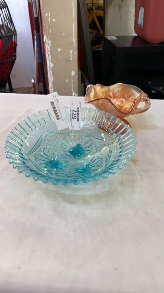 BLUE ART GLASS FOOTED DISH AND CARNIVAL GLASS DISH