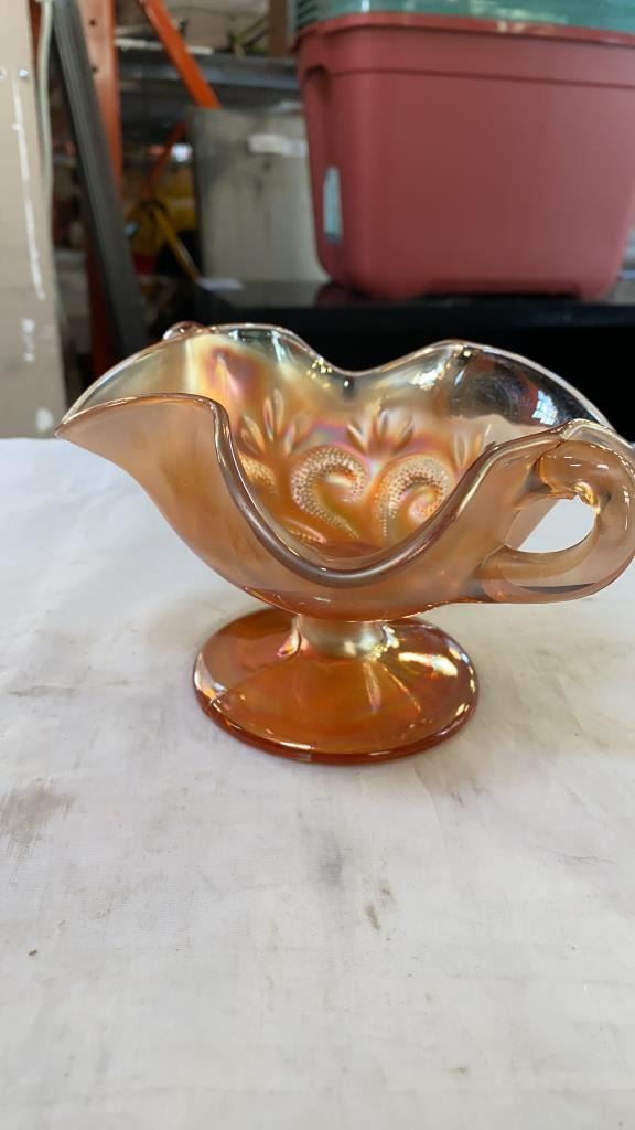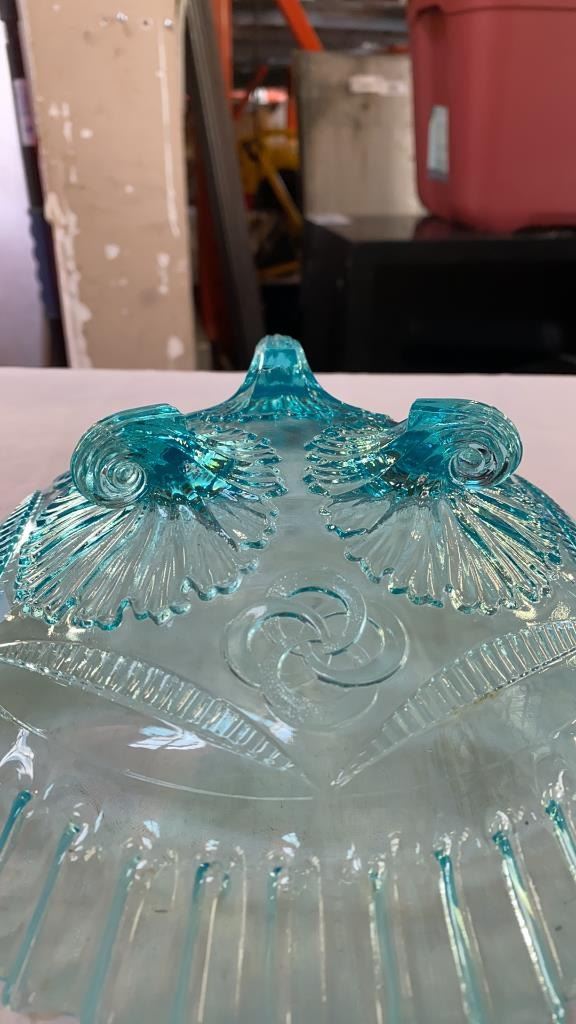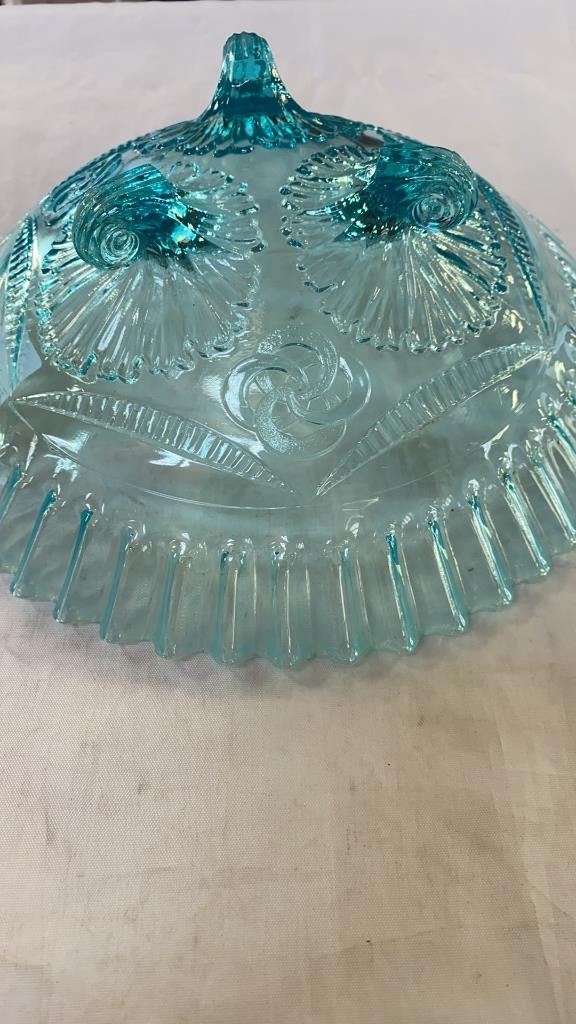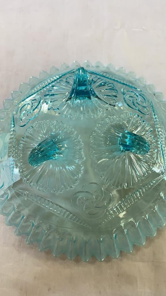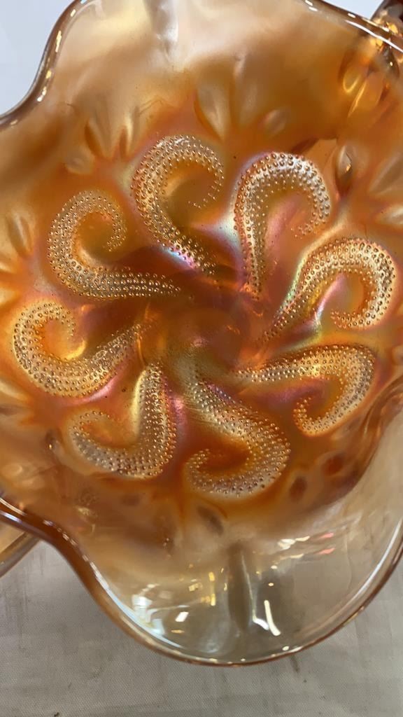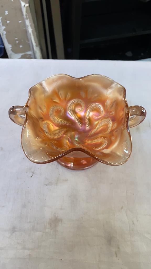 BLUE ART GLASS FOOTED DISH AND CARNIVAL GLASS DISH