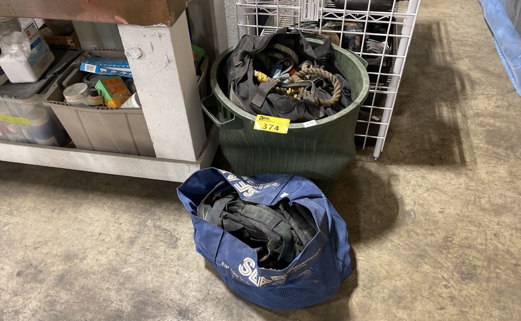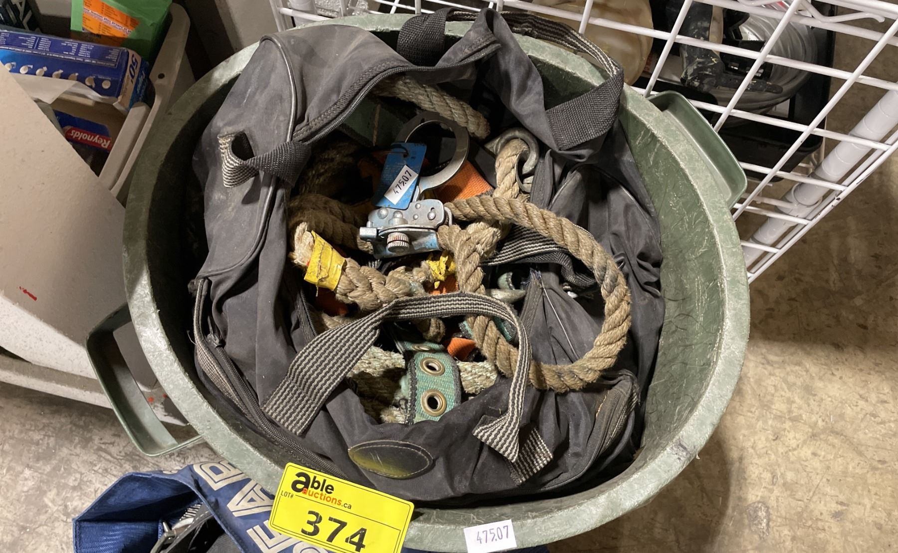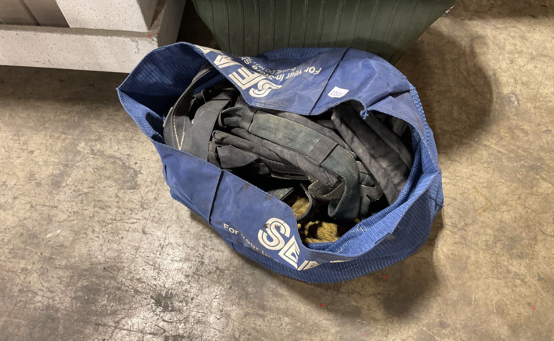 BLUE BAG / GREEN GARBAGE CAN OF ASSORTED RIGGING GEAR, ROPES & CONSTRUCTION HARNESS *GARBAGE CAN INCLUDED*