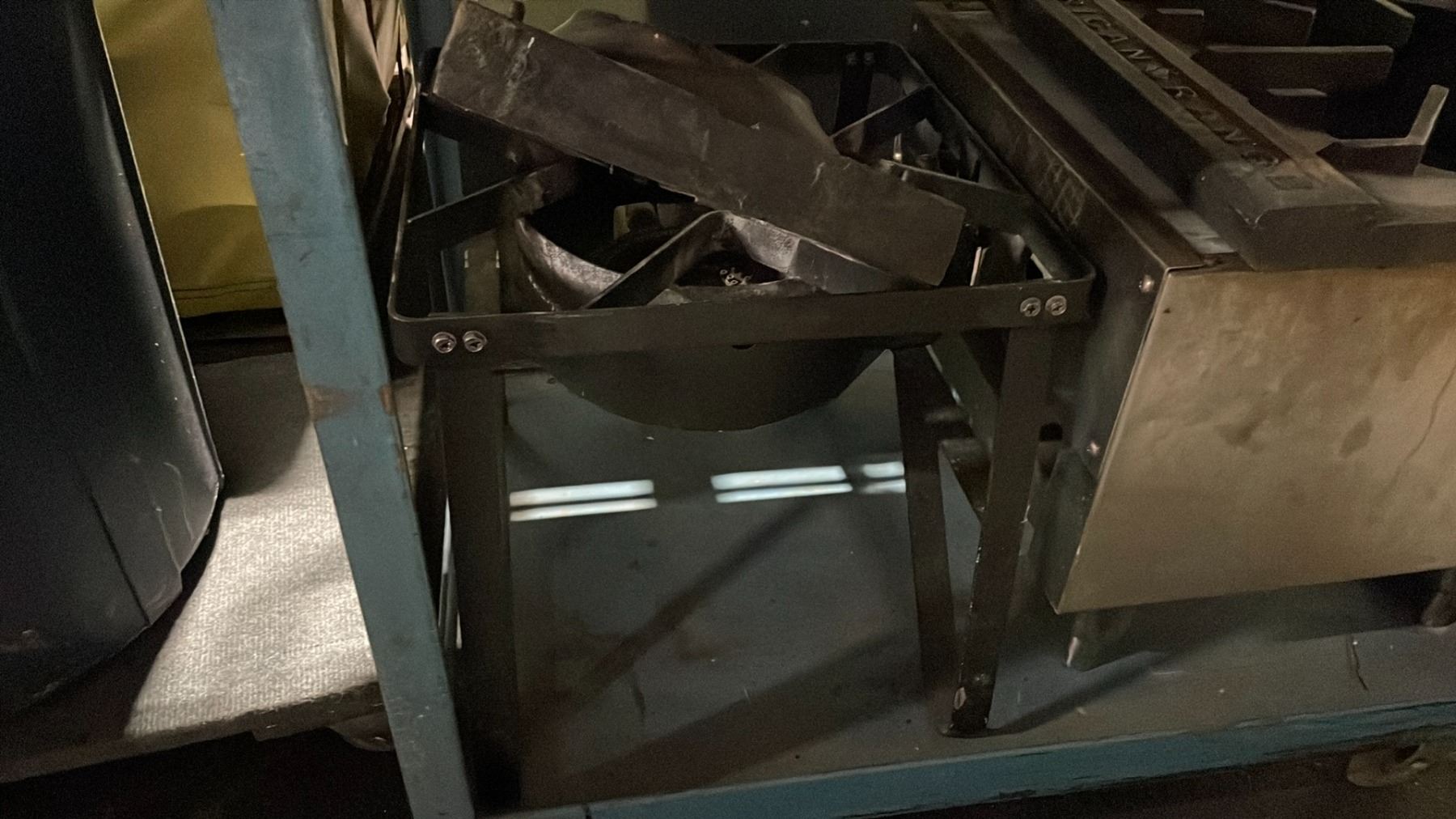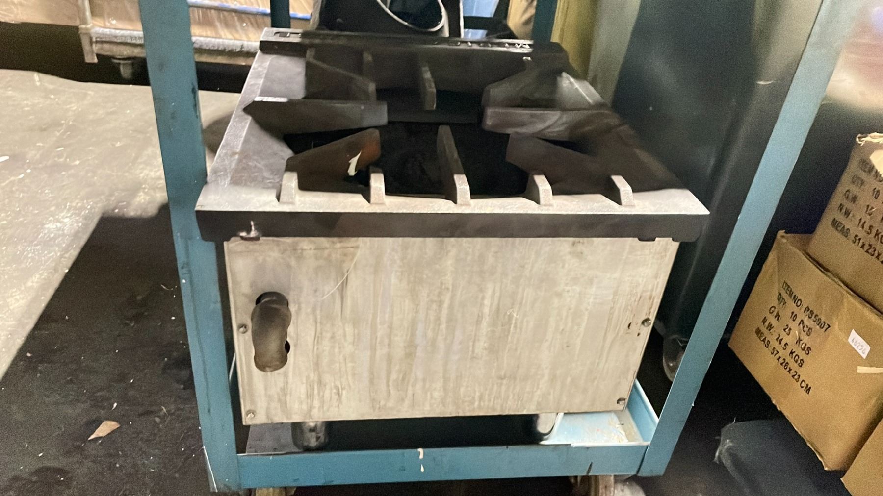 BLUE METAL 2 TIER MOBILE PRODUCT CART WITH 2 COMMERCIAL GAS STOCK POT BURNERS, ALUMINUM LOADING RAMP, & CAST STOVE GRATES *CART INCLUDED*