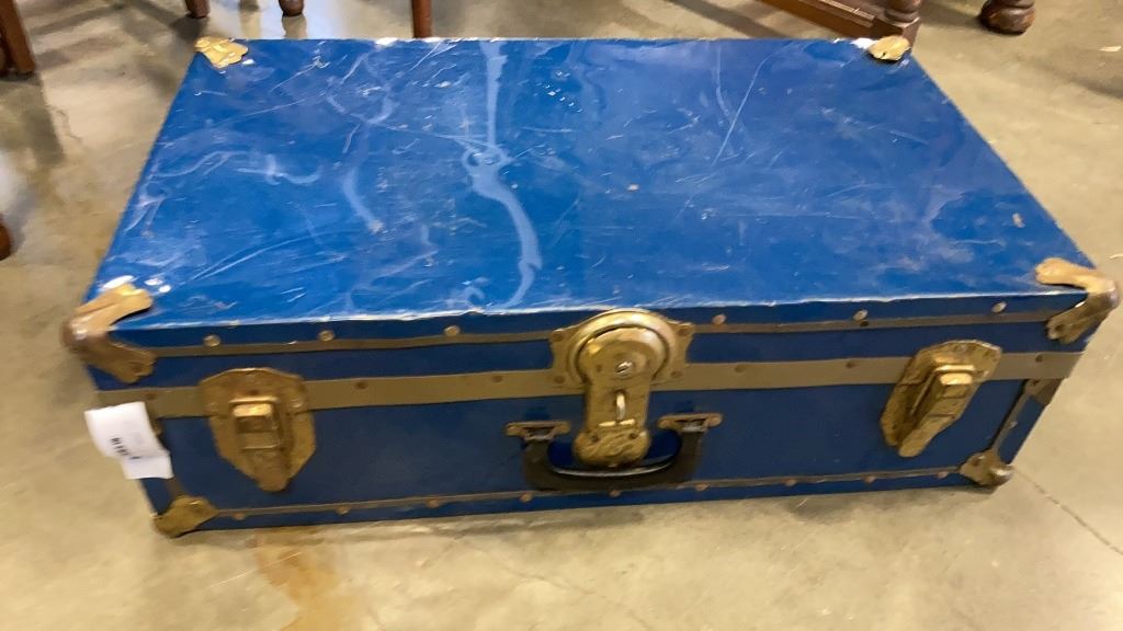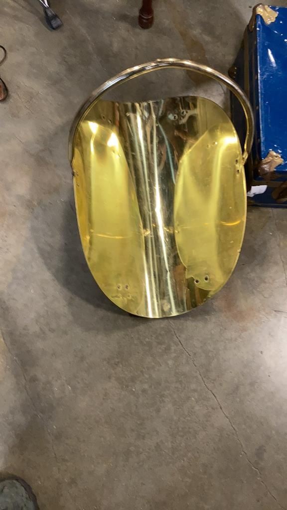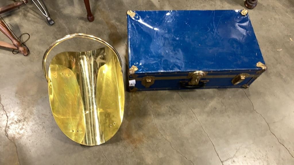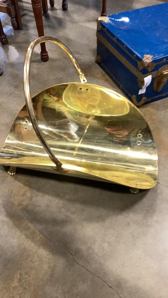 BLUE METAL TRUNK AND BRASS LOG HOLDER