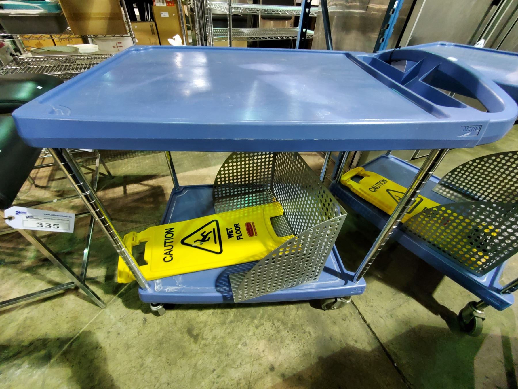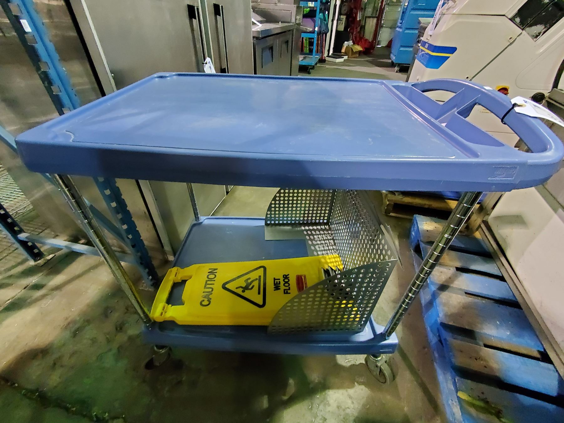 BLUE METRO 2 TIER MOBILE PRODUCT CART WITH WET FLOOR SIGN AND STYLIZED CASH-RESISTER GUARD