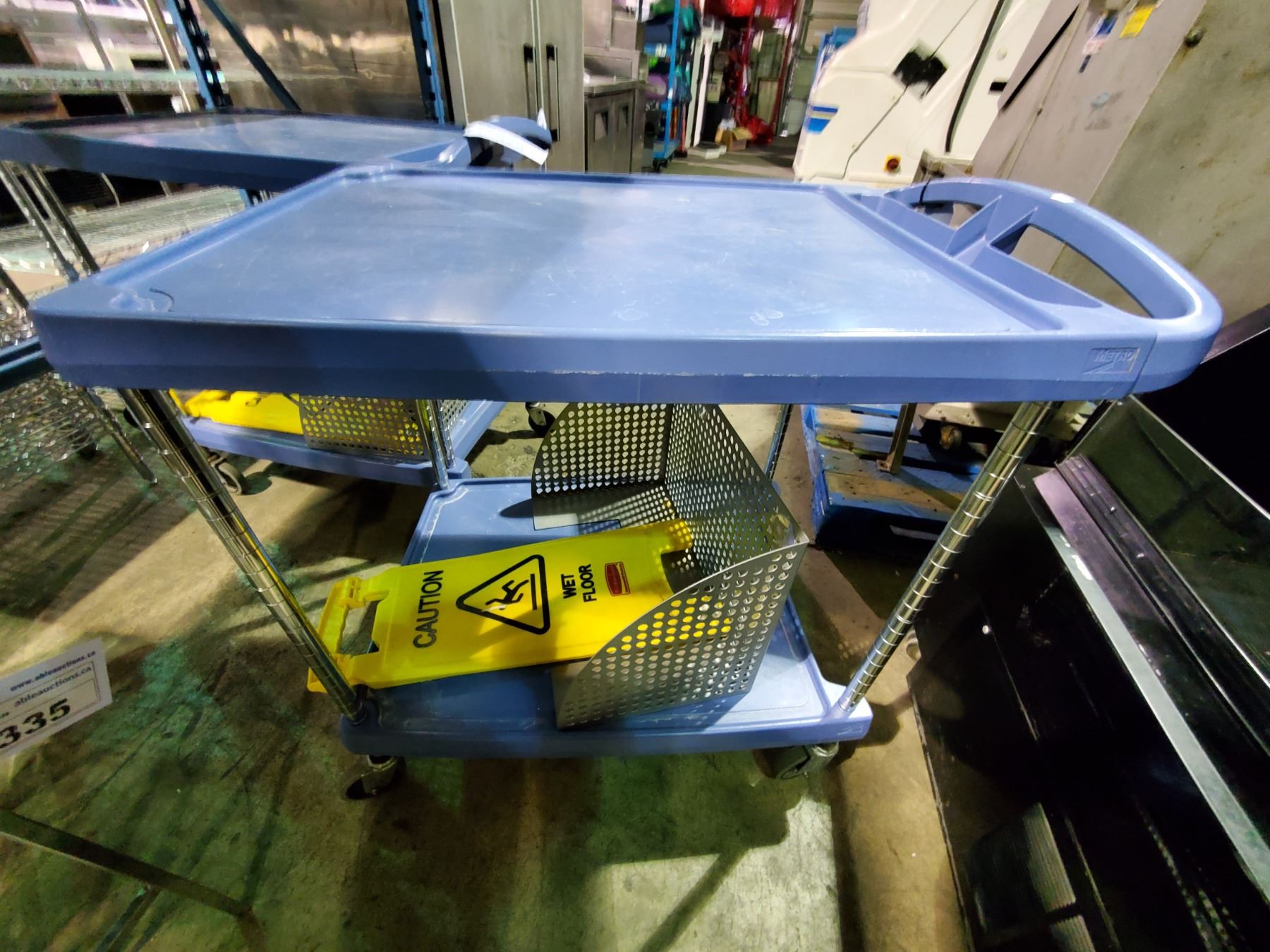 BLUE METRO 2 TIER MOBILE PRODUCT CART WITH WET FLOOR SIGN AND STYLIZED CASH-RESISTER GUARD