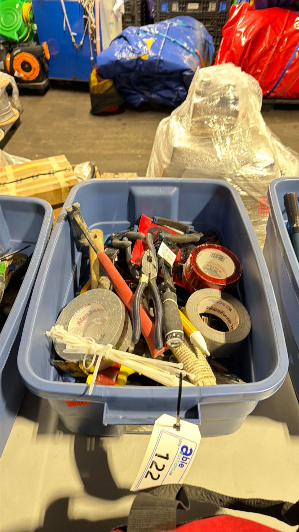 BLUE PLASTIC BIN OF ASSORTED HAND TOOLS *BIN INCLUDED&