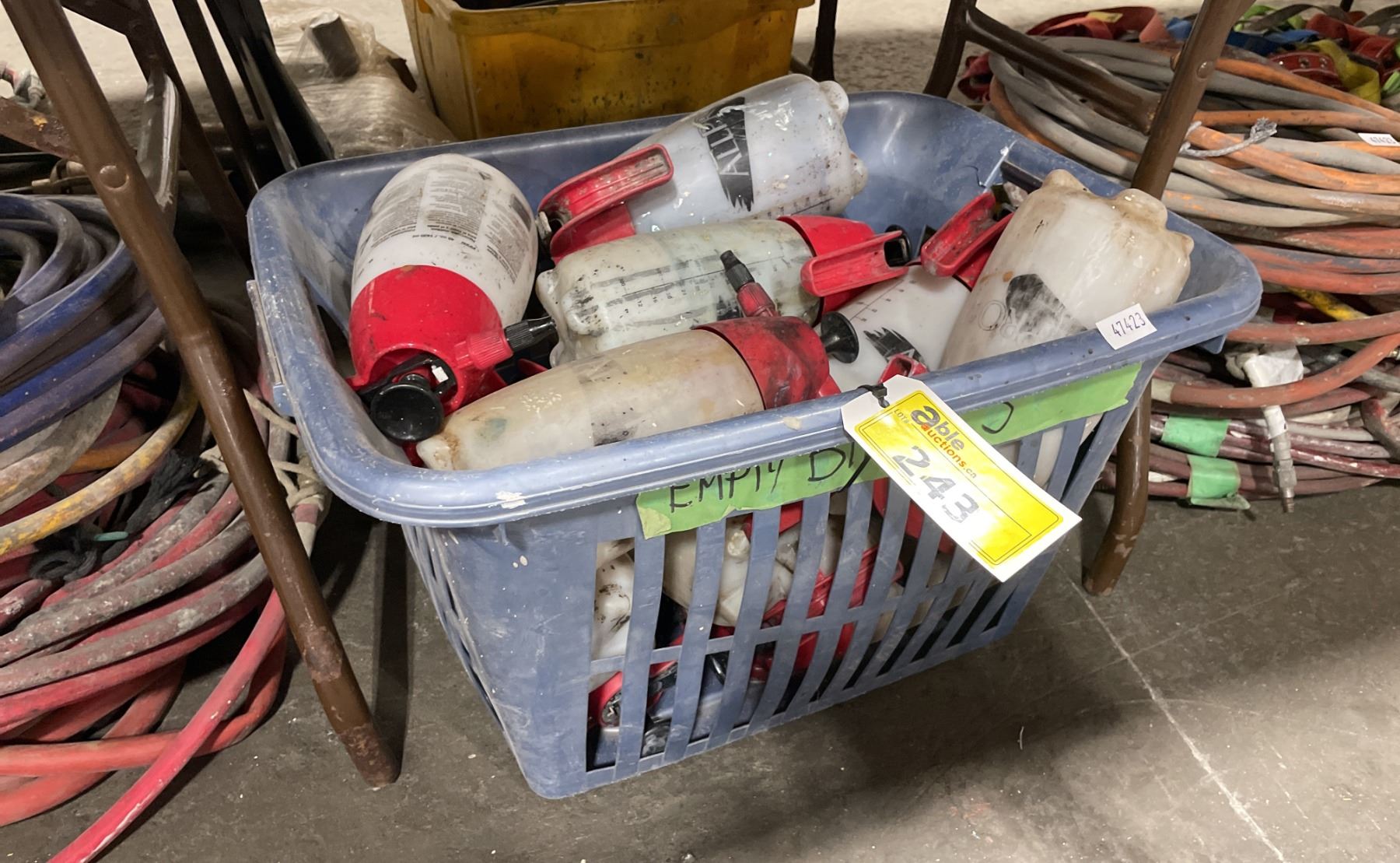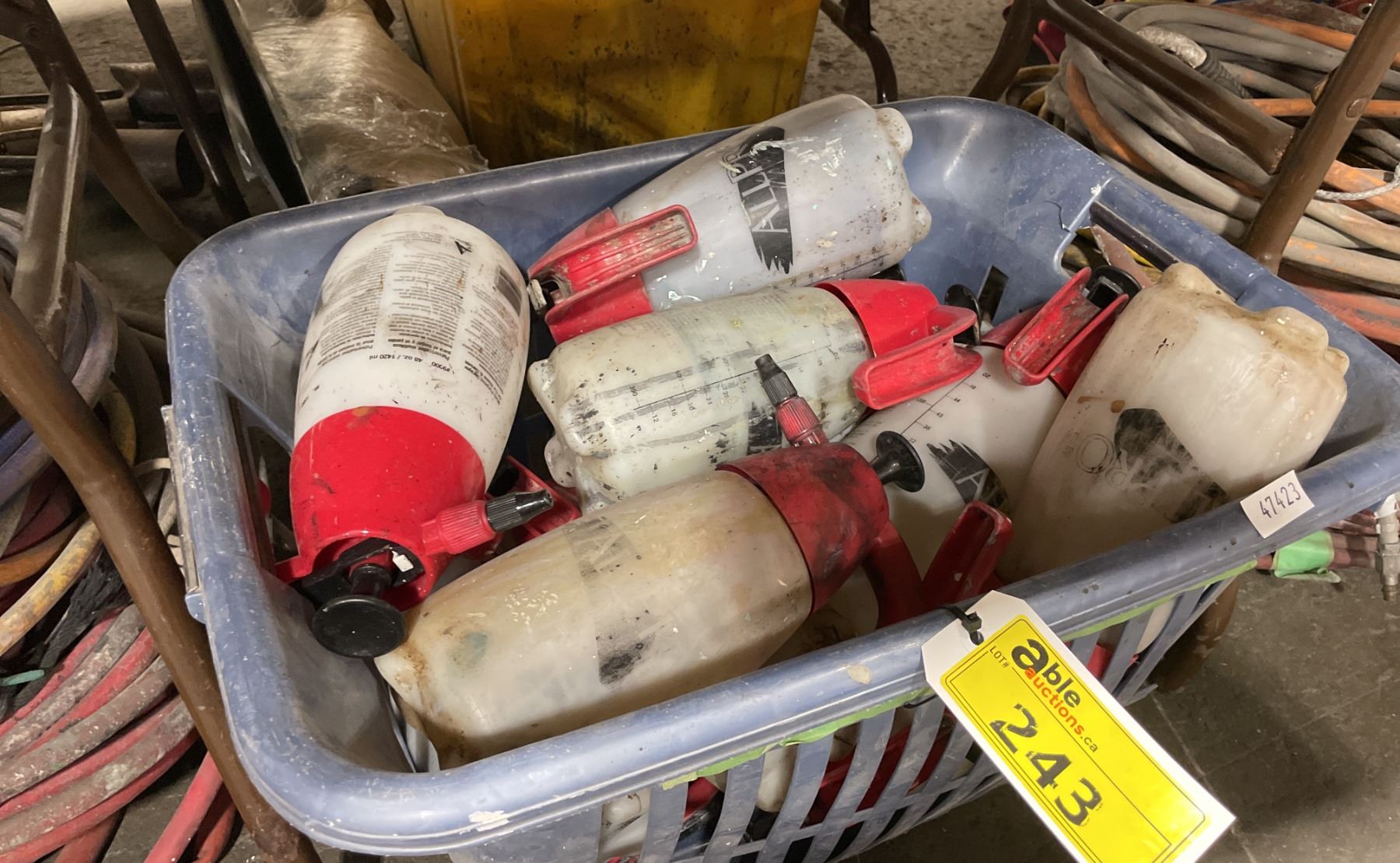 BLUE PLASTIC BIN OF ASSORTED INDUSTRIAL HAND HELD CHEMICAL SPRAYERS *BIN INCLUDED*