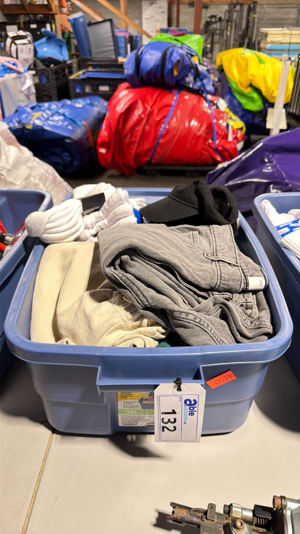 BLUE PLASTIC BIN OF ASSORTED NEW DESIGNER CLOTHING *BIN INCLUDED*
