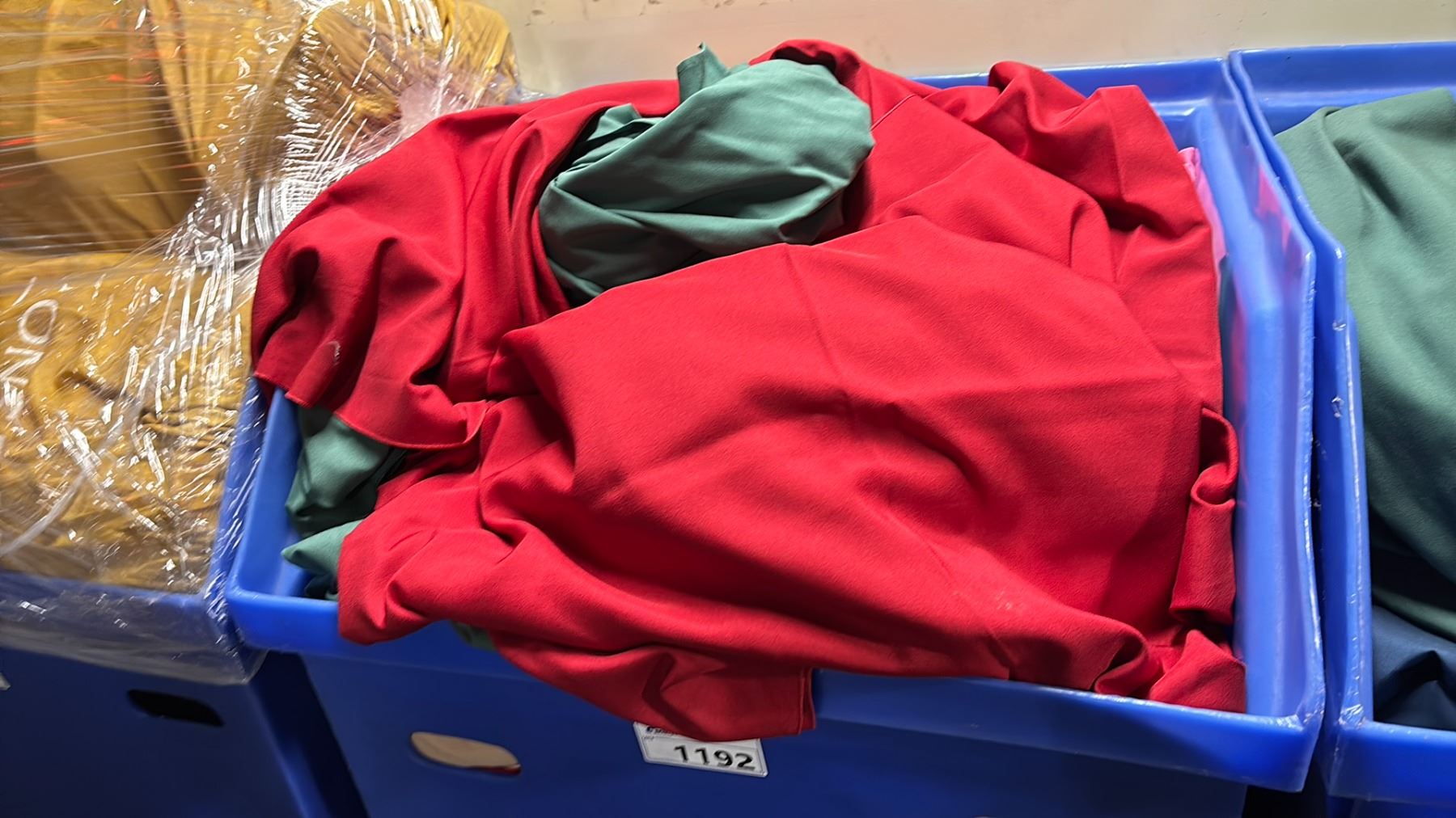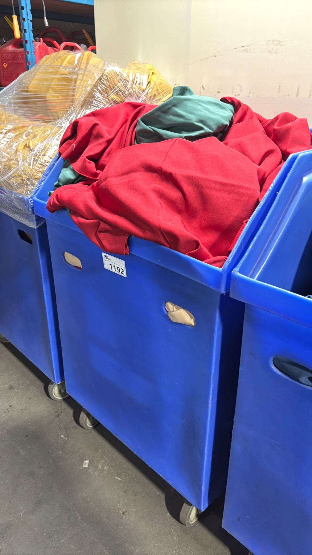 BLUE PLASTIC MOBILE EVENT CART WITH ASSORTED COLOR PROFESSIONAL EVENT / BANQUET TABLE LINENS *PLASTIC BIN INCLUDED* - BIN SIZE 31"W X 32"D X 47"H