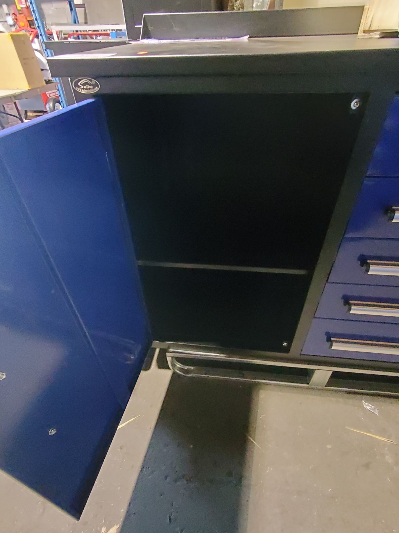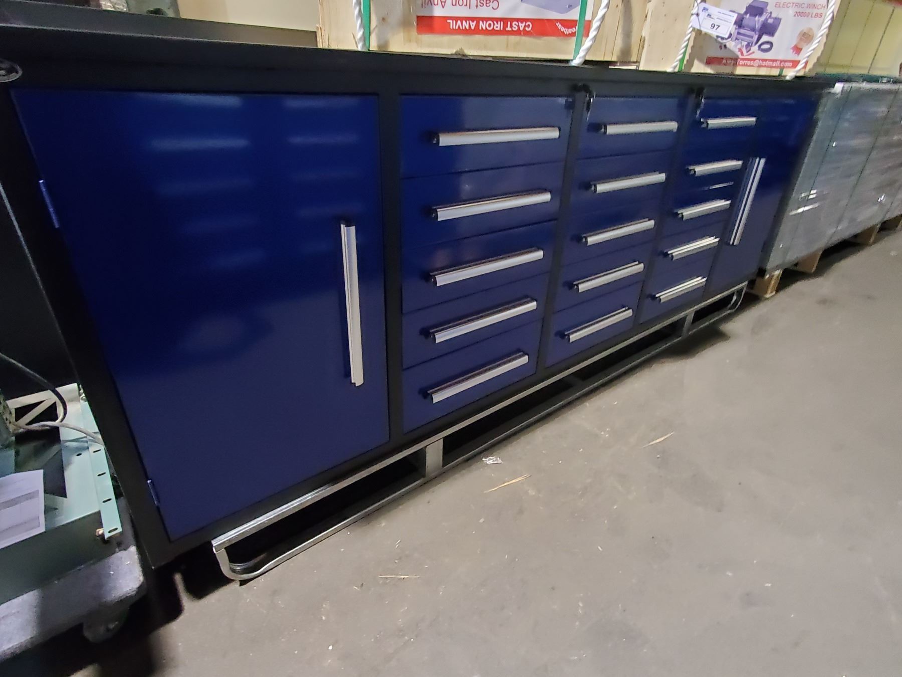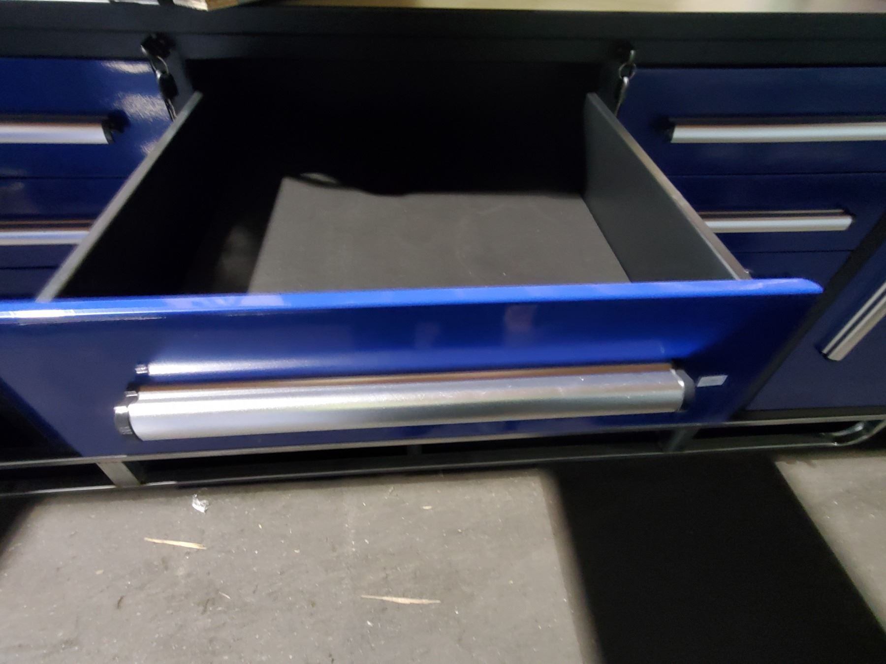 BLUE STEELMAN 15 DRAWER 2 DOOR WORK BENCH H36" X W113" X D29" WITH ANTI-SLIP LINING LOCKING DRAWERS AND KEY, AND THREE RAIL SLIDERS WITH 50KG CAPACITY PER DRAWER, MODEL: 10FT-15D-2-01B