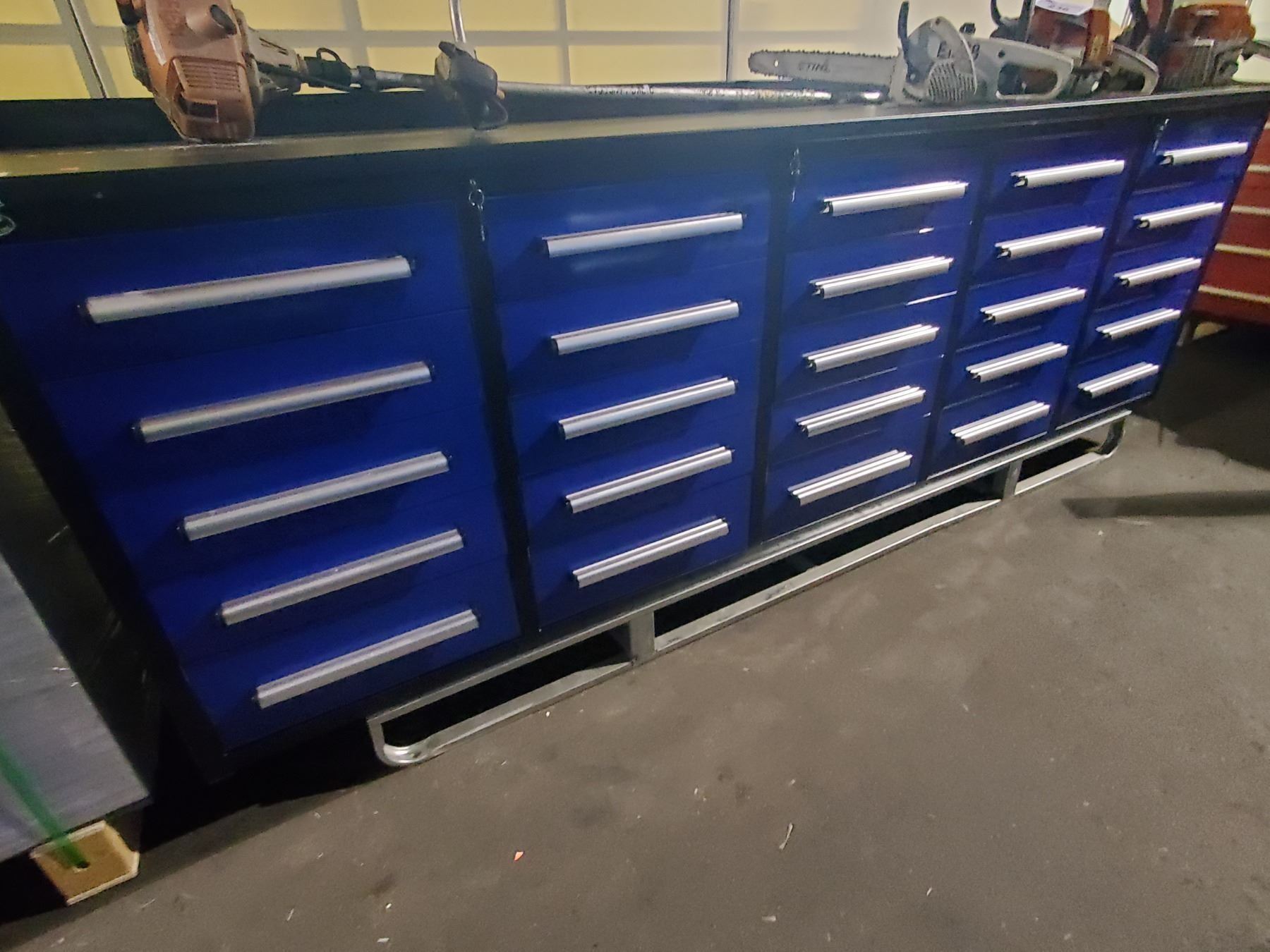 BLUE STEELMAN 25 DRAWER WORK BENCH H36" X W113" X D29" WITH ANTI-SLIP LINING LOCKING DRAWERS AND KEY, AND THREE RAIL SLIDERS WITH 50KG CAPACITY PER DRAWER, MODEL: 10FT-25D-01B