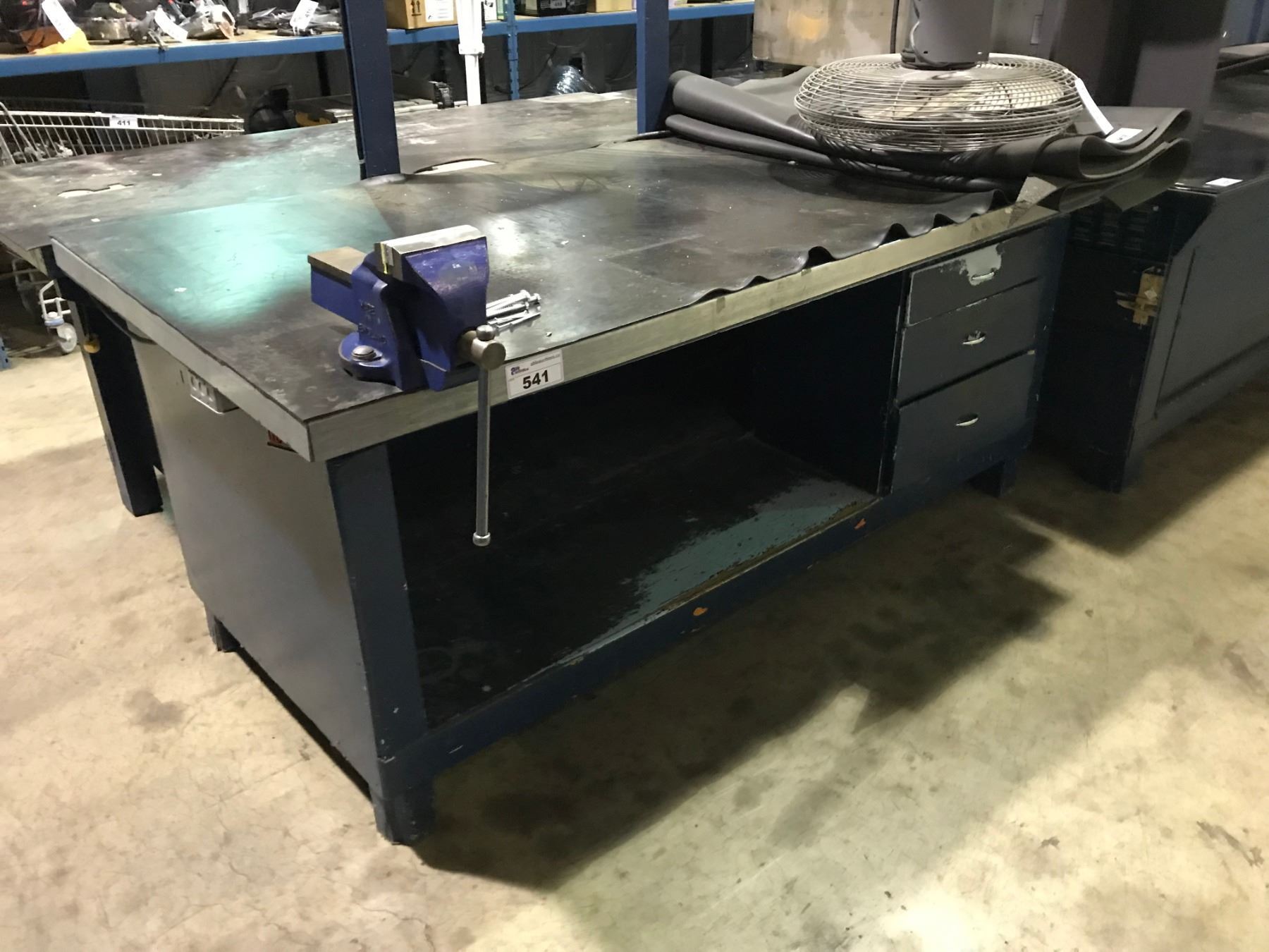 BLUE WOODEN HEAVY DUTY POWERED ILLUMINATED WORK BENCH WITH BENCH VISE