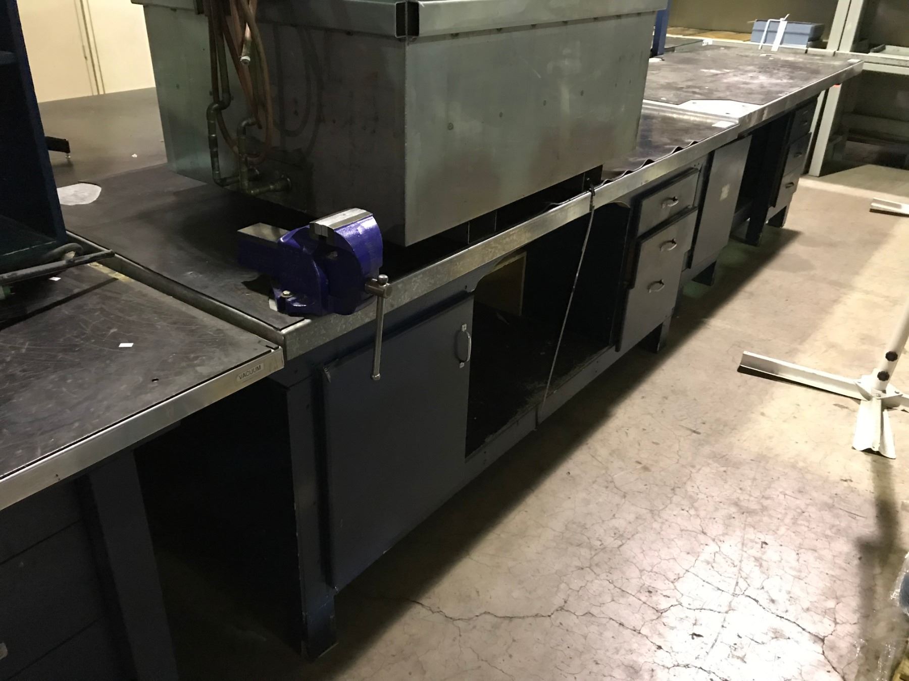 BLUE WOODEN HEAVY DUTY POWERED ILLUMINATED WORK BENCH WITH BENCH VISE