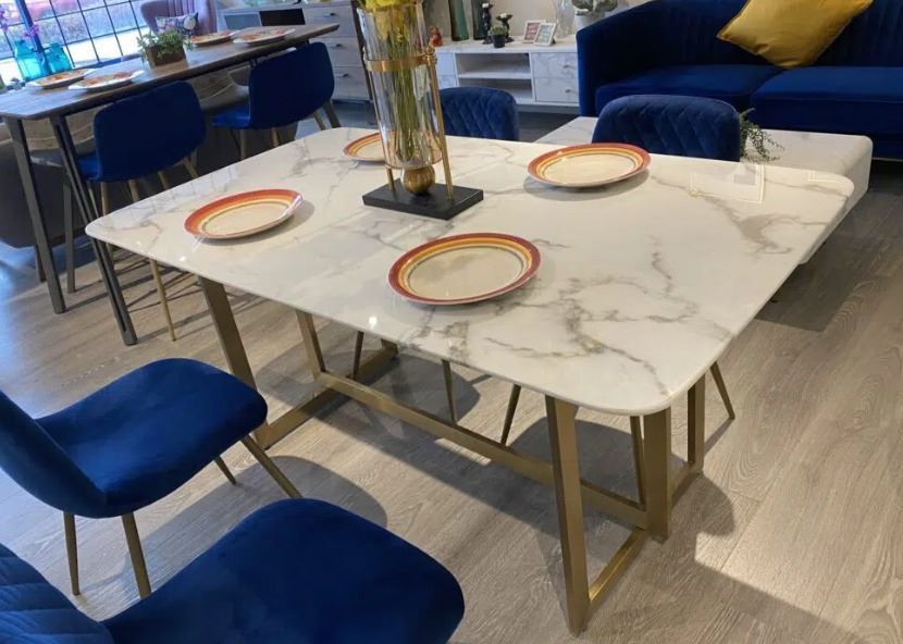 Brand new in box. beautiful round marble dining table with artistic base. Size options include 59or 71diameter and base finishes in gold or silver. Selected variant: 59" Gold.