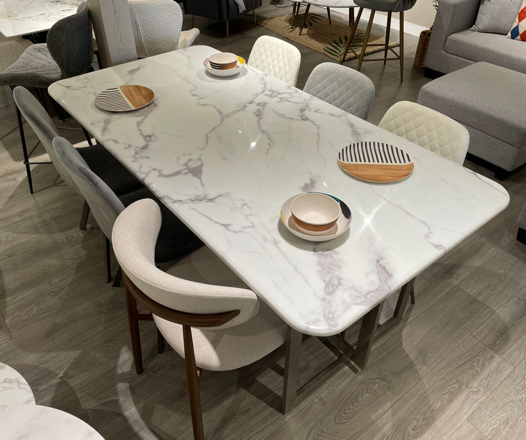 Brand new in box. beautiful round marble dining table with artistic base. Size options include 59or 71diameter and base finishes in gold or silver. Selected variant: 59" Gold.