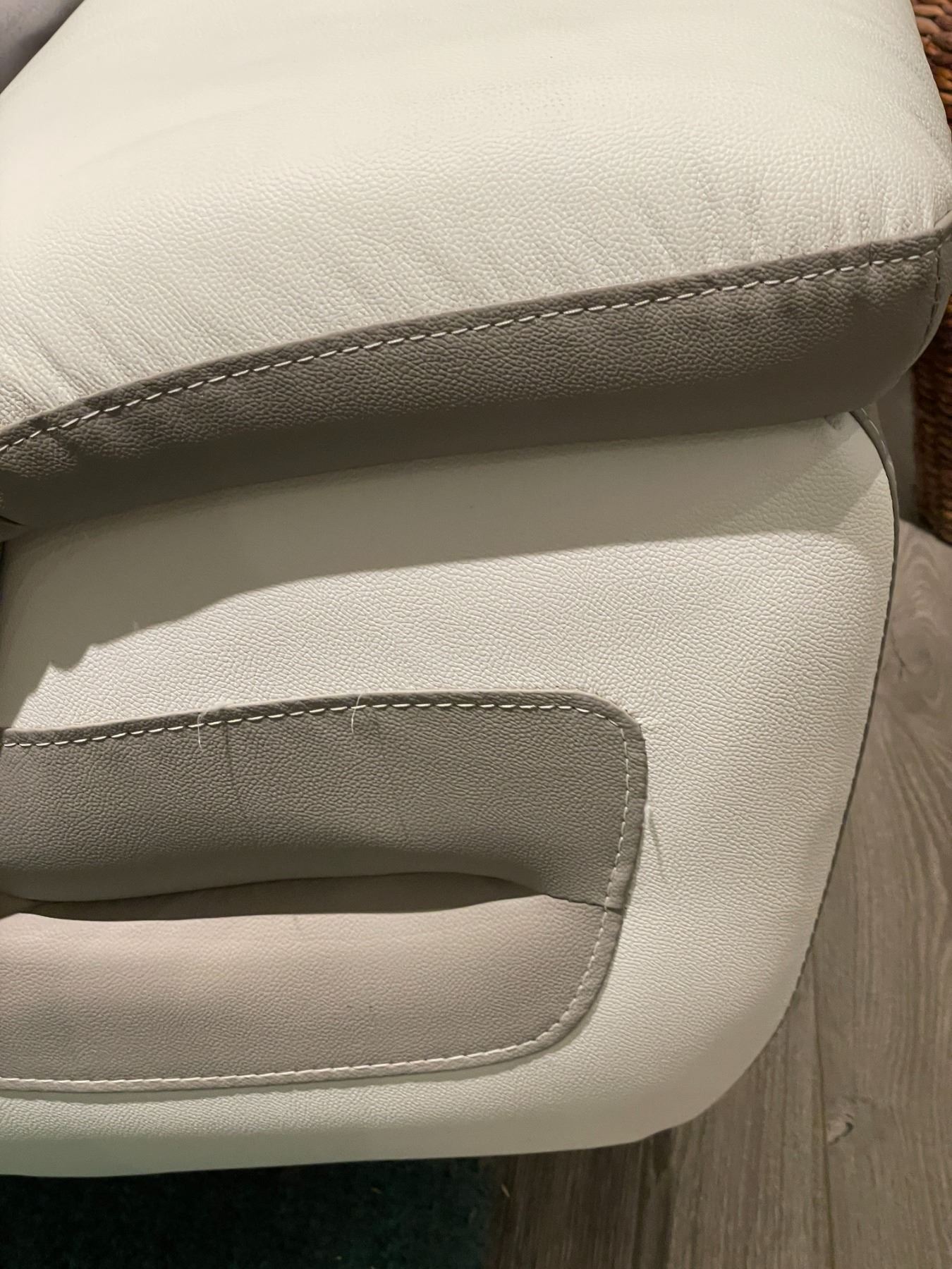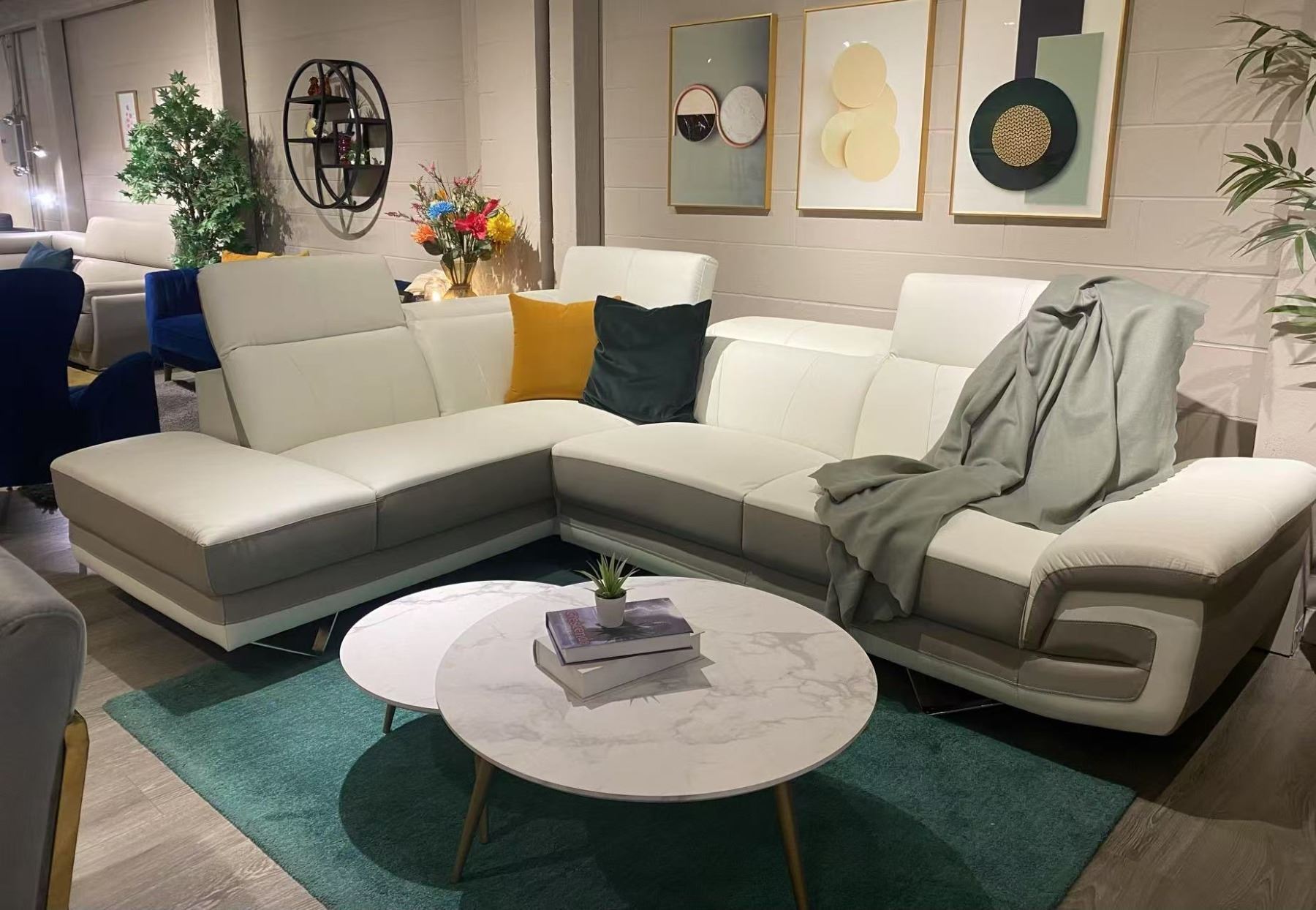 Brand new in box. premium real leather L‑shape sectional couch with optional cup holder. Dimensions approx 116”L x 38”D x 40”H; chaise length 85”; colours white/grey or black; chaise direction right or left. Selected variant: Grey - Left Hand Facing.