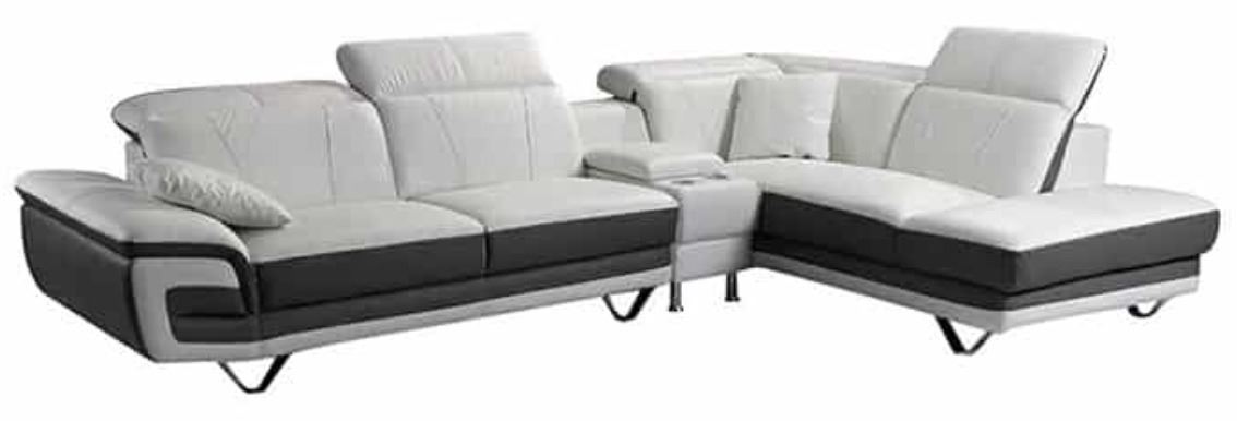Brand new in box. premium real leather Lshape sectional couch with optional cup holder. Dimensions approx 116L x 38D x 40H; chaise length 85; colours white/grey or black; chaise direction right or left. Selected variant: white/grey - Right Hand Facing.