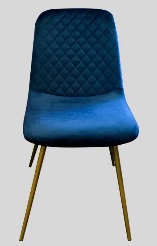 Brand new in box. set of four comfy dining chairs with quality fabric cover and metal legs. Available in light grey, blue velvet, green velvet or white leather. Selected variant: Group of 4 - Blue.