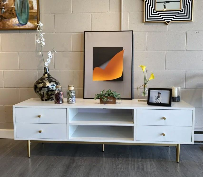 Brand new in box. modern design marblecolour TV stand with four drawers and shelves. Size about 63L ◊ 16D ◊ 20H; colours walnut or concrete.