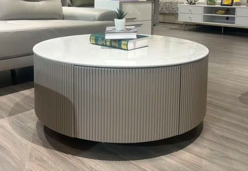 Brand new in box. modern sintered stone top round coffee table with drawers. Diameter approx 35”, height 15”; colour oak.