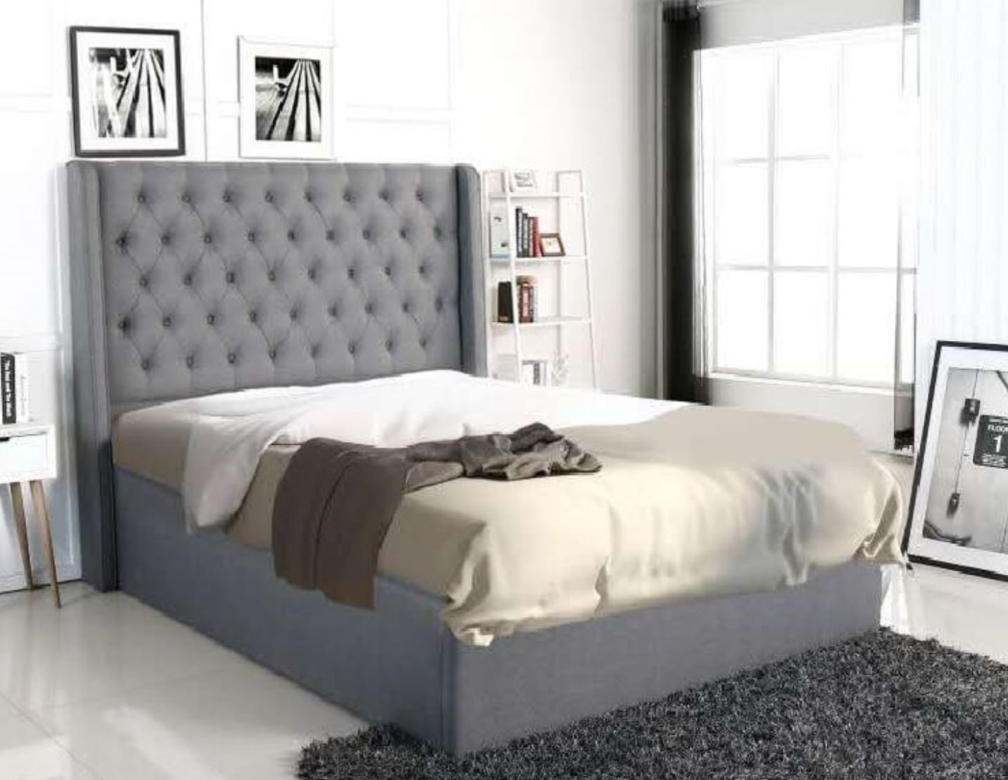 Brand new in box. fabric platform bed frame with liftup storage compartment. Plush headboard about 57high; colours light beige, light grey or dark grey. Selected variant: King - Light Grey.