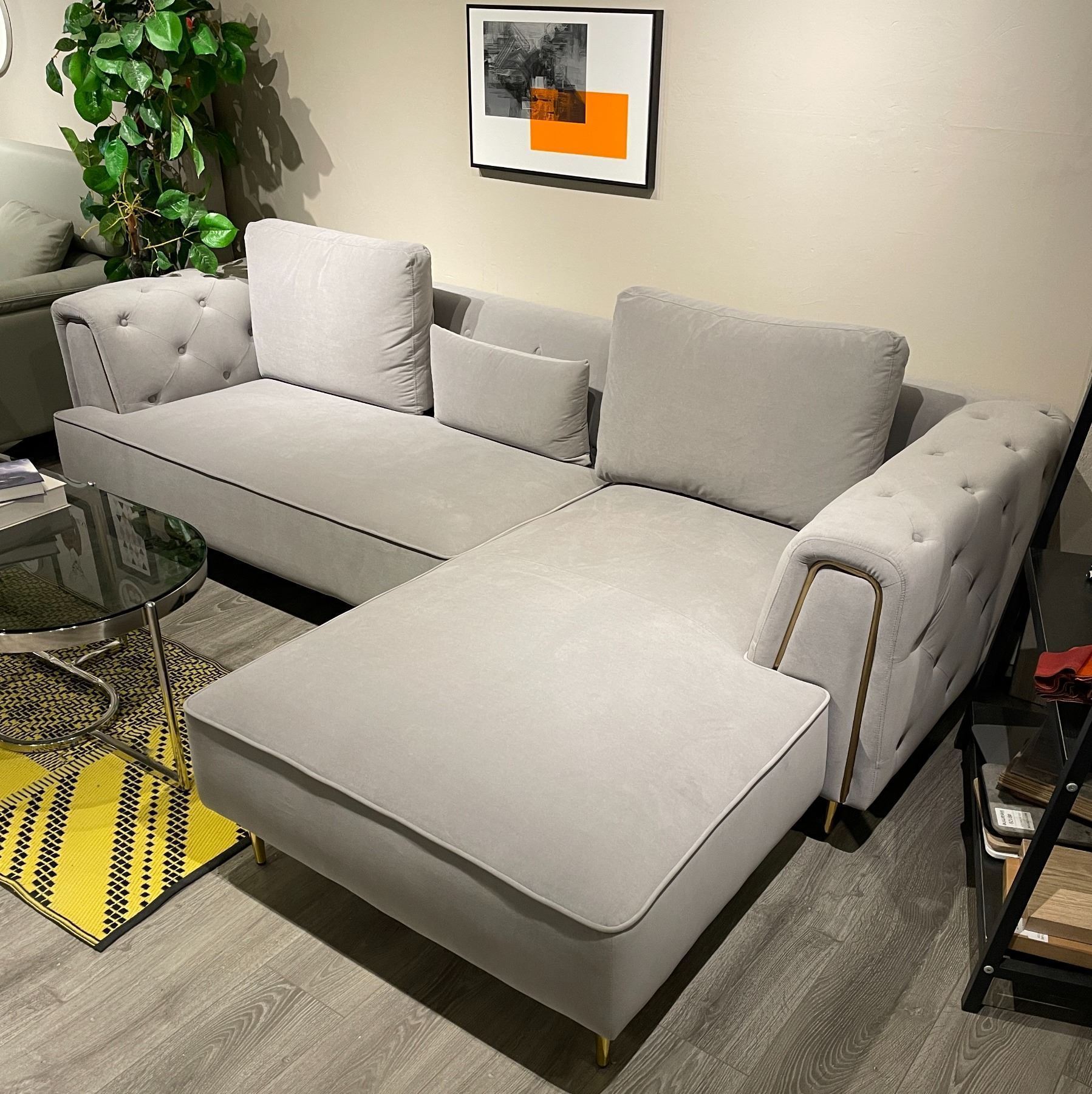 Brand new in box. contemporary design quality fabric Lshape sectional couch with comfortable velvet upholstery. Size about 105L x 37D x 30H with chaise 68. Colours light grey or dark grey; chaise direction can be right or left. Selected variant: Left Hand Facing - Light Grey.