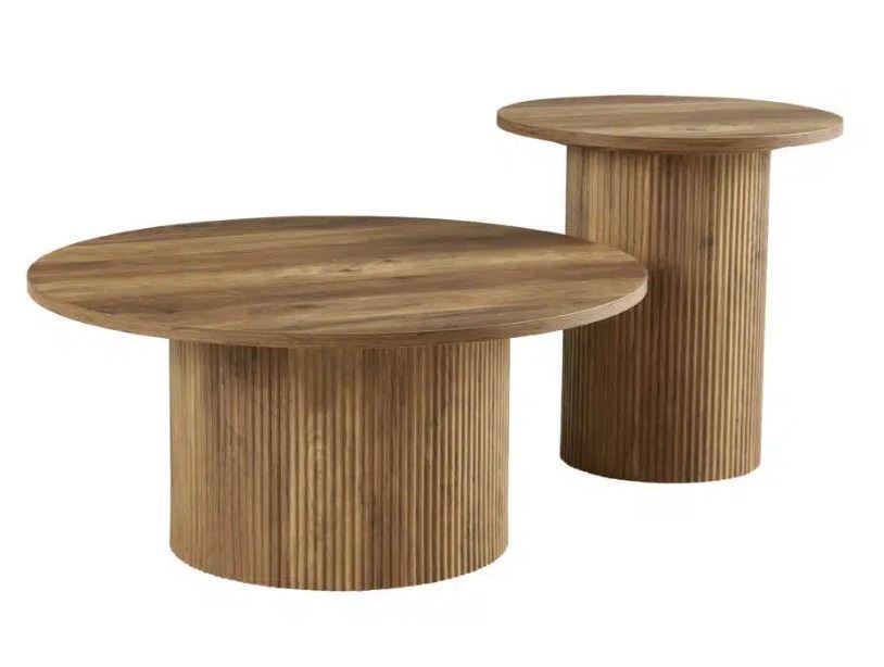 Brand new in box. unique mushroomdesign woodcolour coffee table set. Big piece approx 31.5diameter ◊ 15H; small piece 20diameter ◊ 20.5H.