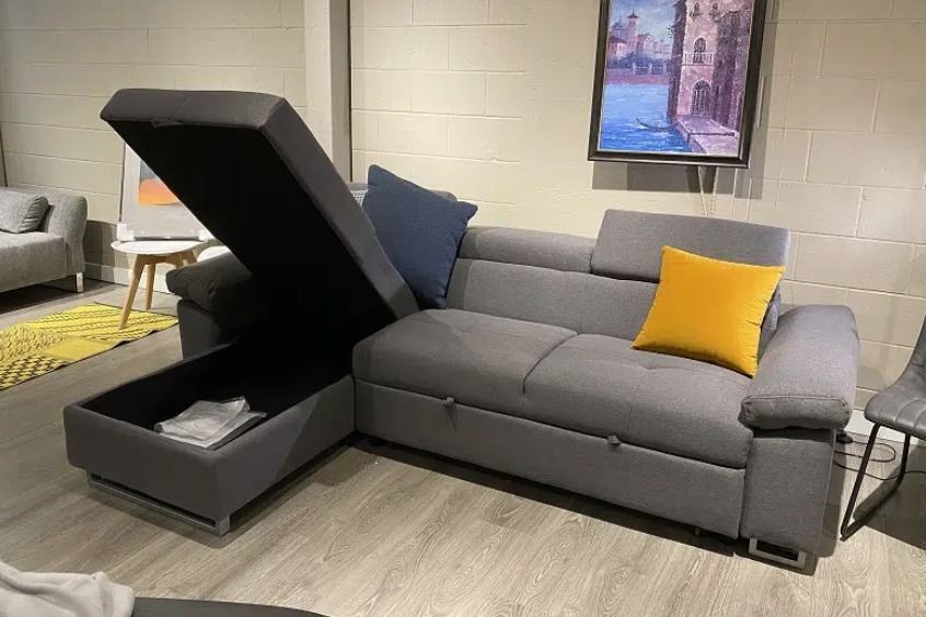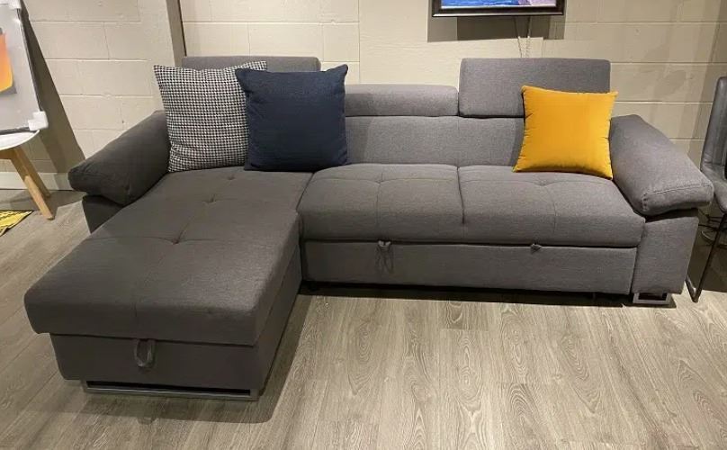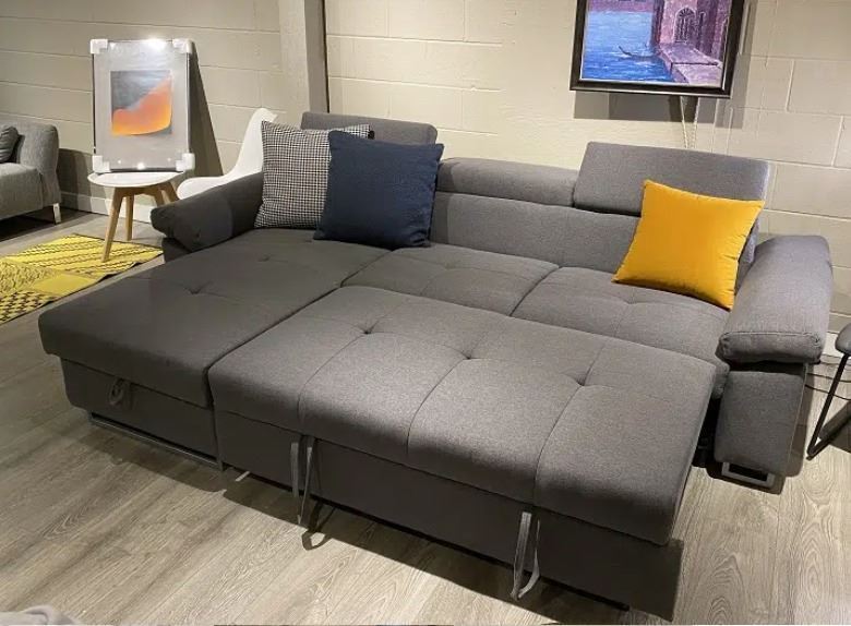 Brand new in box. fabric Lshape sofa bed featuring three adjustable headrests and storage under the chaise. Size approx 100L x 34D x 35H; chaise 66; colours grey or offwhite. Selected variant: Light Grey.