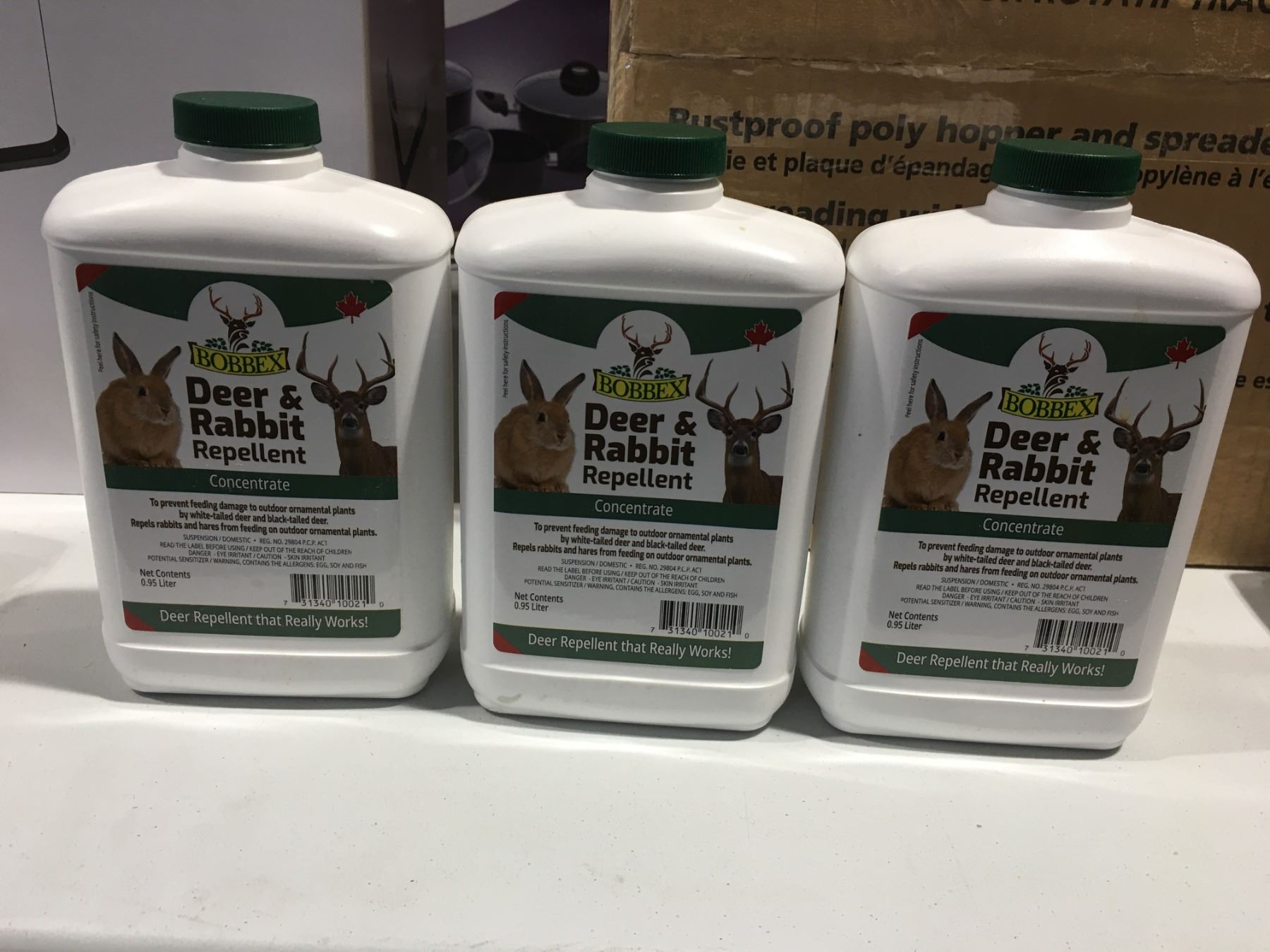 BOBBEX DEER & RABBIT REPELLENT CONCENTRATE 3 X .95 L BOTTLES THIS REPELLENT USES ALL NATURAL, ENVIRONMENTALLY FRIENDLY INGREDIENTS TO PRODUCE A WIDE RANGE OF SCENT AND TASTE DETERRENTS. SAFE FOR USE ON ALL ORNAMENTAL PLANTS, TREES AND SHRUBS. MSRP $35.99 EACH.