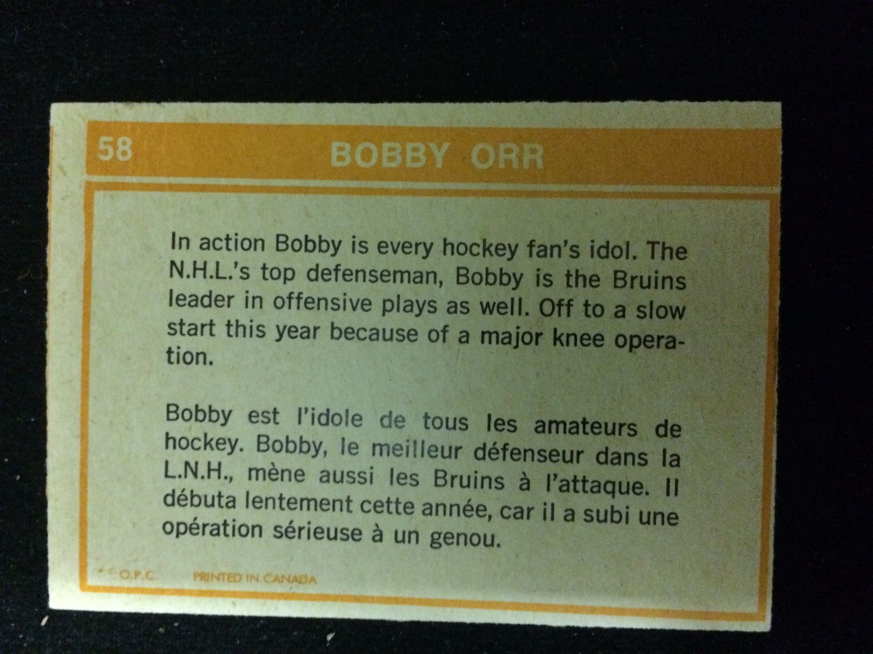 BOBBY ORR #58 O-PEE-CHEE HOCKEY TRADING CARD