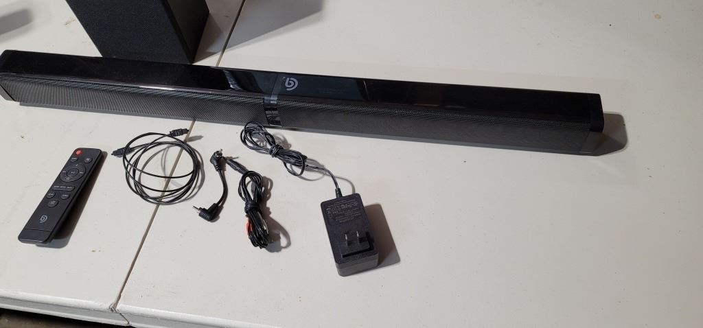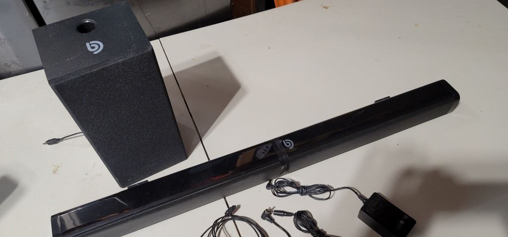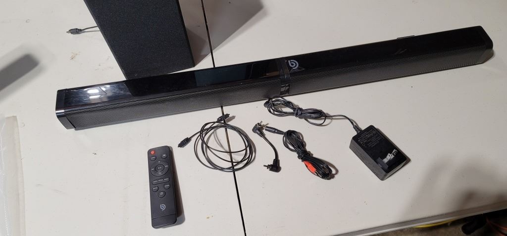 BOMAKER TAPIO V SOUNDBAR AND SUBWOOFER TESTED AND WORKING WITH CORD, REMOTE AND ACESSORIES RETAIL $1