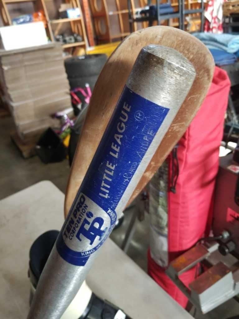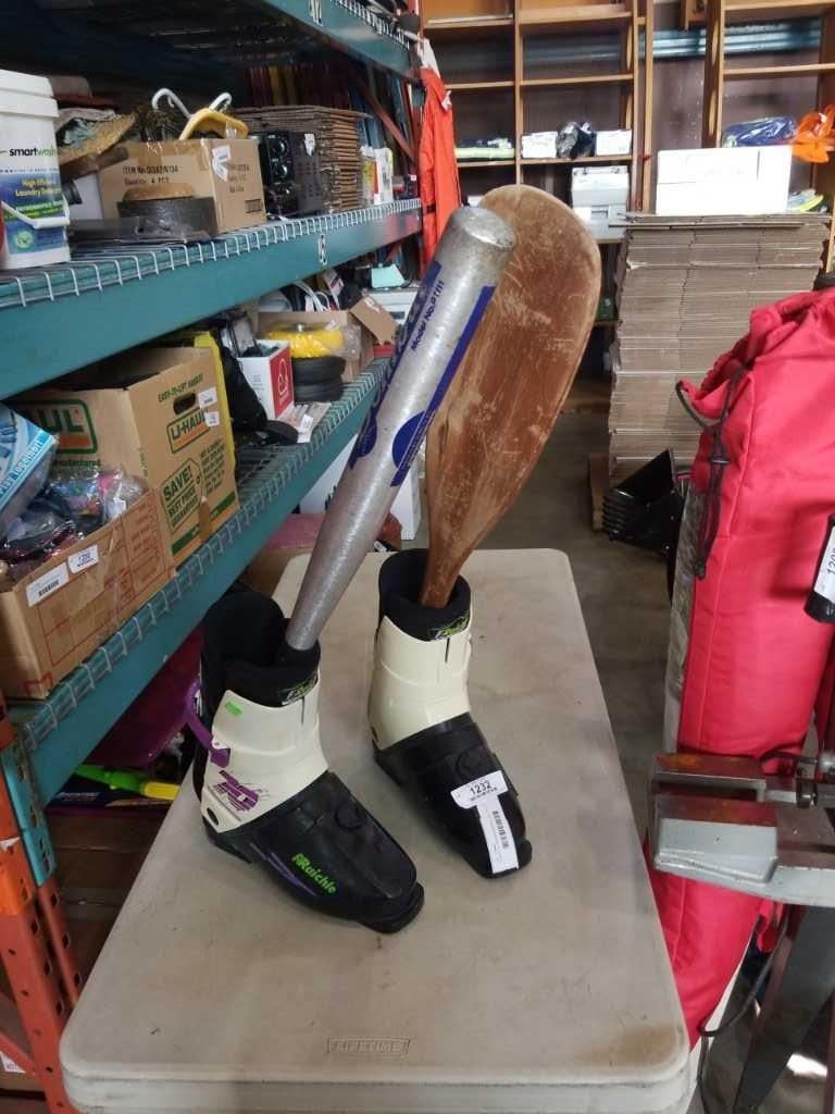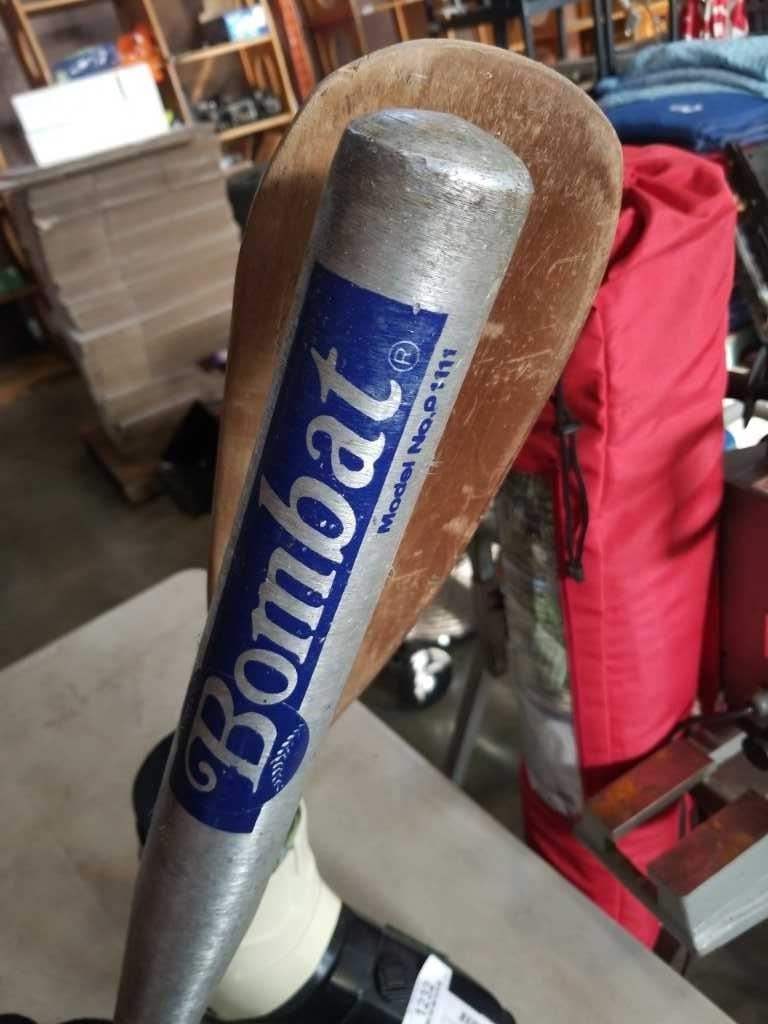 BOMBAT ALUMINUM BASEBALL BAT, WOOD PADDLE AND SKI BOOTS