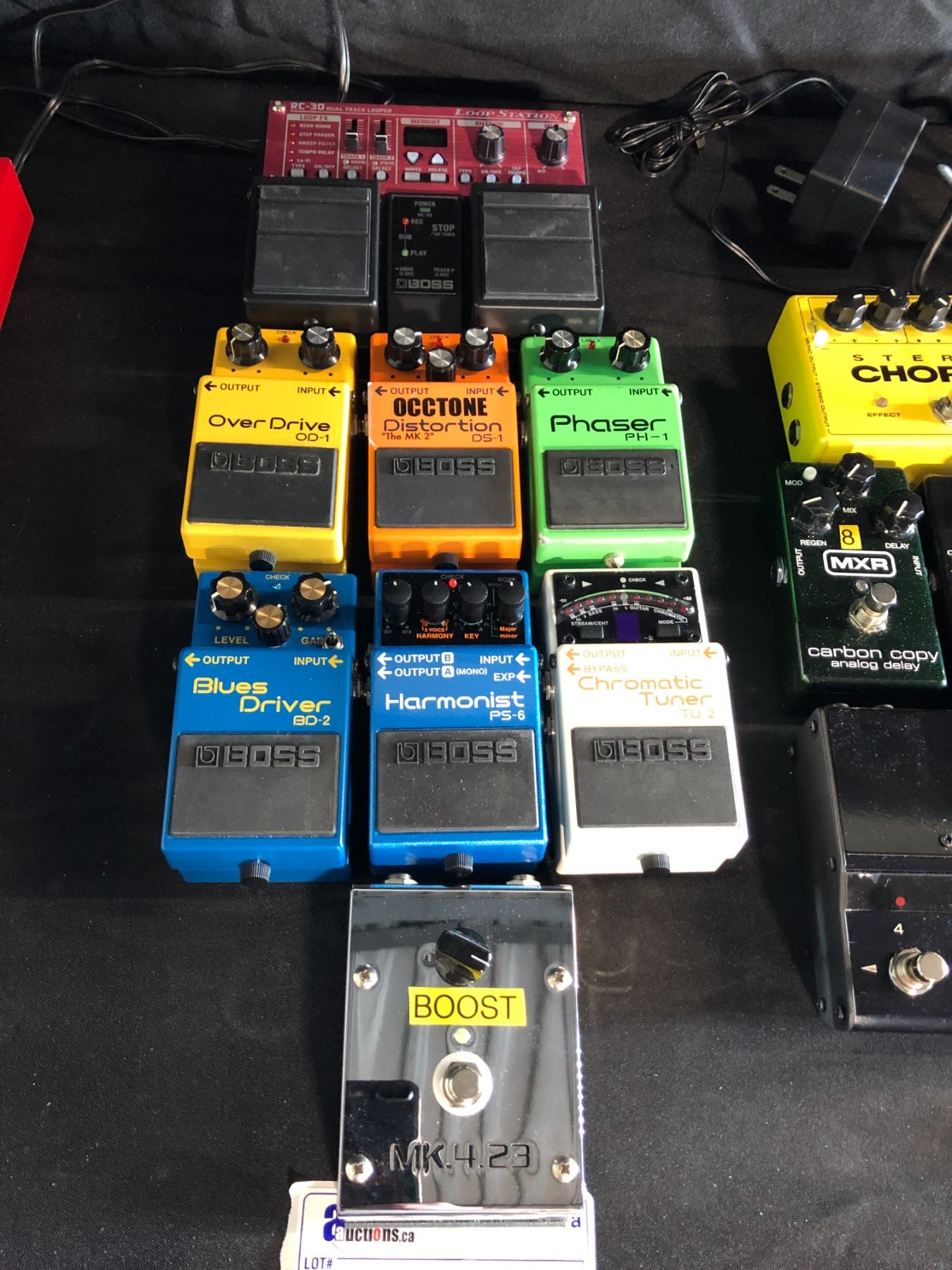 BOSS LOOP STATION, OVERDRIVE, DISTORTION, PHASER, BLUES DRIVER, HARMONIST, CHROMATIC TUNER AND MK