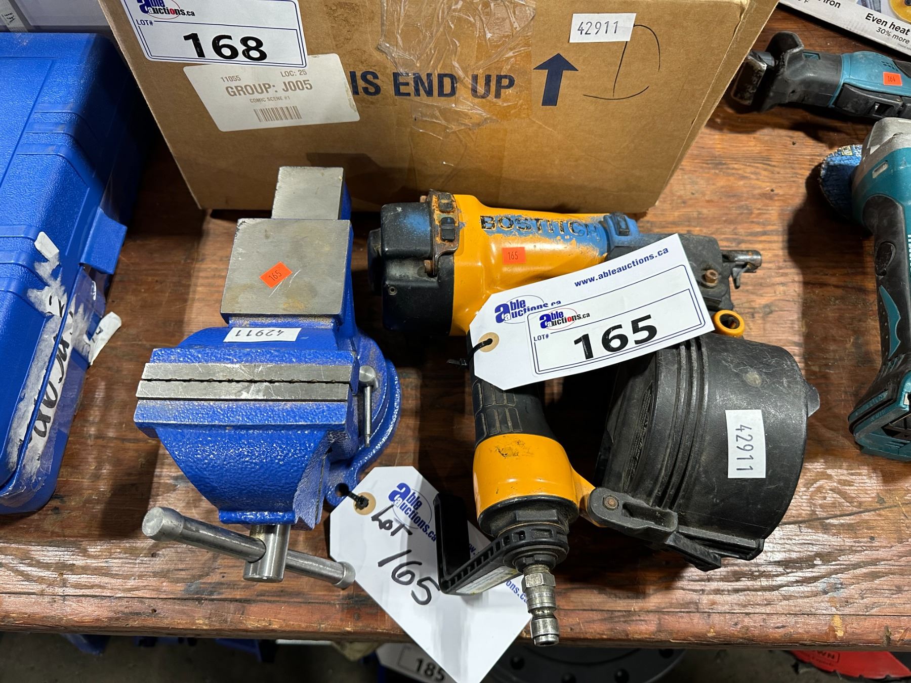 BOSTITCH PNEUMATIC NAILER GUN WITH DRUM FEEDER AND SMALL BLUE PORTABLE VICE